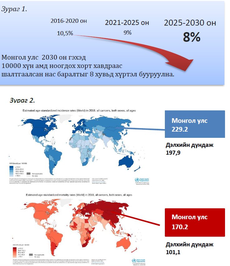 - ДЭМБ-ын 2018 оны судалгаагаар 100 мянган хүнд ногдох хорт хавдрын өвчлөлийн дэлхийн дундаж 197,9 байгаа бол манай улсад энэ үзүүлэлт 229,2 байна. Мөн 100 мянган хүнд ногдох хорт хавдраас шалтгаалсан нас баралтын дэлхийн дундаж үзүүлэлт 101,1 байхад манай улсад энэ үзүүлэлт 229,2 байна.