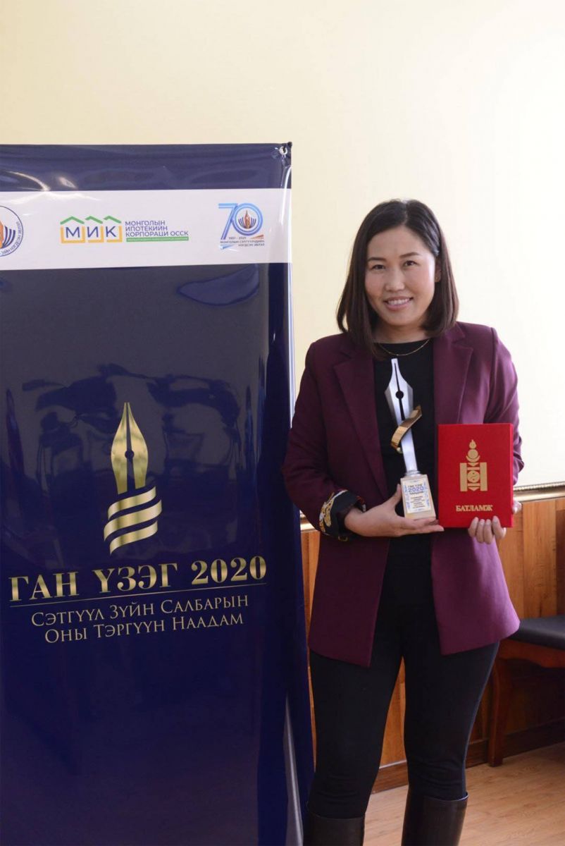 -Баярлалаа. Маш их баяртай байна. “Ган үзэг” шагналаа гардан авч, байгууллагынхаа шилдэг ажилтан боллоо. Маш их үүрэг, хариуцлага нэмэгдлээ гэж бодож байна. Залуучуудын тулгамдсан асуудал, толгойны өвчин болдог зүйл бол орон байр шүү дээ. Телевизийн ажил бол багийн ажил учраас энэ бол миний төдийгүй хамт олны минь шагнал гэж бодож байна. Ажилчдынхаа ар тал, нийгмийн байдлыг харж үздэг удирдлагууддаа гүн талархлаа илэрхийлье. Сэтгүүлч болсон түүхээ ярихын тулд нутаг усаа, ижий аавыгаа дурсахгүй байхын аргагүй. Би сурагч байхдаа Архангай аймгийн Өндөр Улаан суманд ангийнхаа найз Ч.Гэрэлтбат гэдэг хүүхдийн гэрт амьдардаг байлаа. Дөрөвдүгээр ангиа төгсөөд шалгалт шүүлгээ дуусгаад байж байтал аав маань намайг гэр лүү авч явахаар халтар морио унаад, бор морио хөтөлчихсөн ирж билээ. Тэгээд гэр лүүгээ морио унаад Улаан байцын даваа гэдэг хад ихтэй давааг даваад явж байтал аав минь надаас “Миний охин, чи мэргэжил гэж юу байдгийг мэдэх үү. Мөрөөдлөө тодорхойлсон уу” гэж асуулаа. Тухайн үедээ би бодож байгаад “Сэтгүүлч болно” гээд хэлчихсэн. Учир нь тухайн үед зурагтаар “Тэнгэрлэг оршихуй” гээд нэвтрүүлгүүд гардаг байлаа. Аав, ээж хоёр маань тэр нэвтрүүлгүүдийг үзэх маш их дуртай байсан тул намайг үргэлж хүнийг баярлуулдаг, уулзуулдаг сэтгүүлч болоорой гэж захидаг байсан. Ингээд л 10 жилээ төгсөөд хөдөөнөөс улаан хацартай охин анх удаа Улаанбаатарт ирж байлаа. Аав, ээжийн минь зааж өгсөн зам мөрөөр сэтгүүлч болж “Улаанбаатар Эрдэм-Оюу” сургуулийг 2010 онд сэтгүүлчийн ангийг төгсөөд “Зууны мэдээ” сониноос ажил амьдралынхаа гарааг эхлүүлсэн. Ингээд 2011 оны есдүгээр сарын 01-нд ТВ8 телевиз гэх их айлд орж ирсэн дээ.