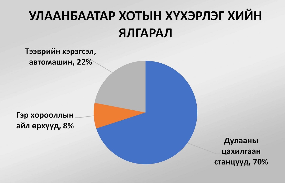 Агаар дахь хүхэрлэг хийн агууламжийг хамгийн ихээр ялгаруулдаг зүйл нь цахилгаан станцын яндангаас гарах түүхий нүүрсний утаа аж. Тодруулбал, цахилгаан станцын яндангаас 70 орчим хувь нь, автомашины яндангаас 22-23 хувь, айл өрхийн хэрэглээний түлшнээс 7-8 хувь ялгарч байгааг Жайка олон улсын хамтын ажиллагааны байгууллагын шугамаар хийсэн судлагаа нотолдог юм.