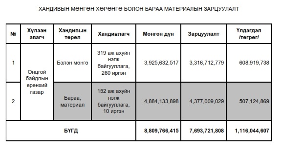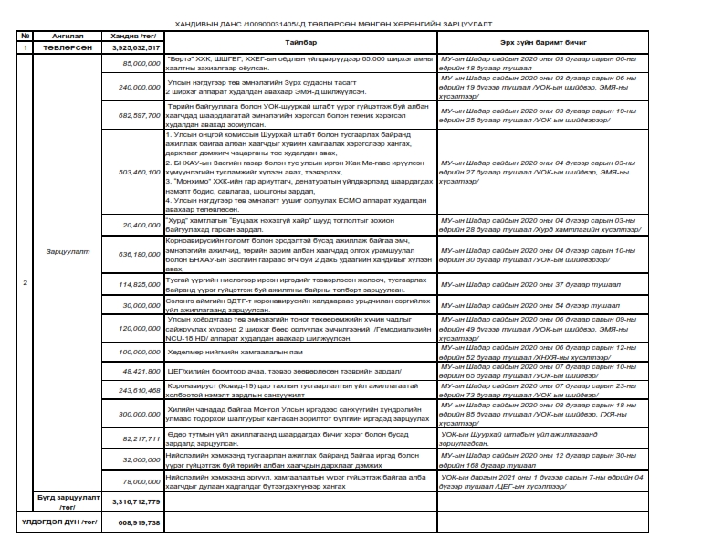2021 оны хоёрдугаар сарын 03-ны байдлаар хандивын мөнгөн хөрөнгөөс 3 тэрбум 316 сая 712 мянга 779 төгрөгийг зарцуулж, 608 сая 919 мянга 738 төгрөгийн үлдэгдэлтэй байна. Харин хандивын бараа материалаас 3 тэрбум 377 сая гаруйг нь зарцуулж, үлдэгдэл 507 сая 124 мянга 869 төгрөгийн үнэ бүхий бараа материал байна.