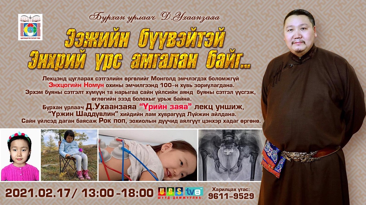 “Ээжийн бүүвэйтэй энхрий үрс амгалан байг” гэсэн уриан дор явагдах хандивын лекцийг Шинийн 7-ны Дашнямтай билэгт сайн өдөр 13:00-18:00 цагийн хооронд UBS, TV8, Channel11 гэсэн гурван телевизээр шууд дамжуулах юм.