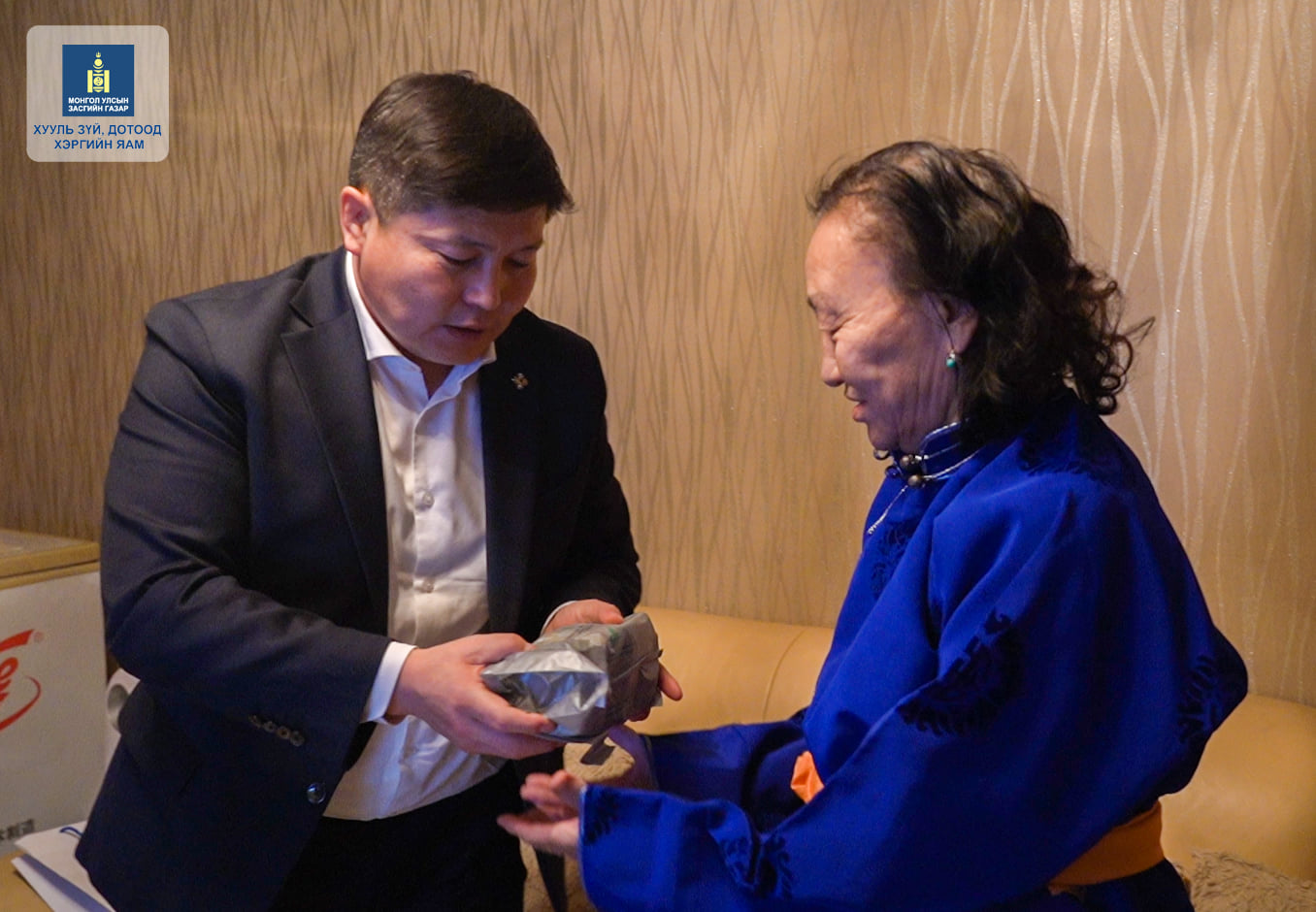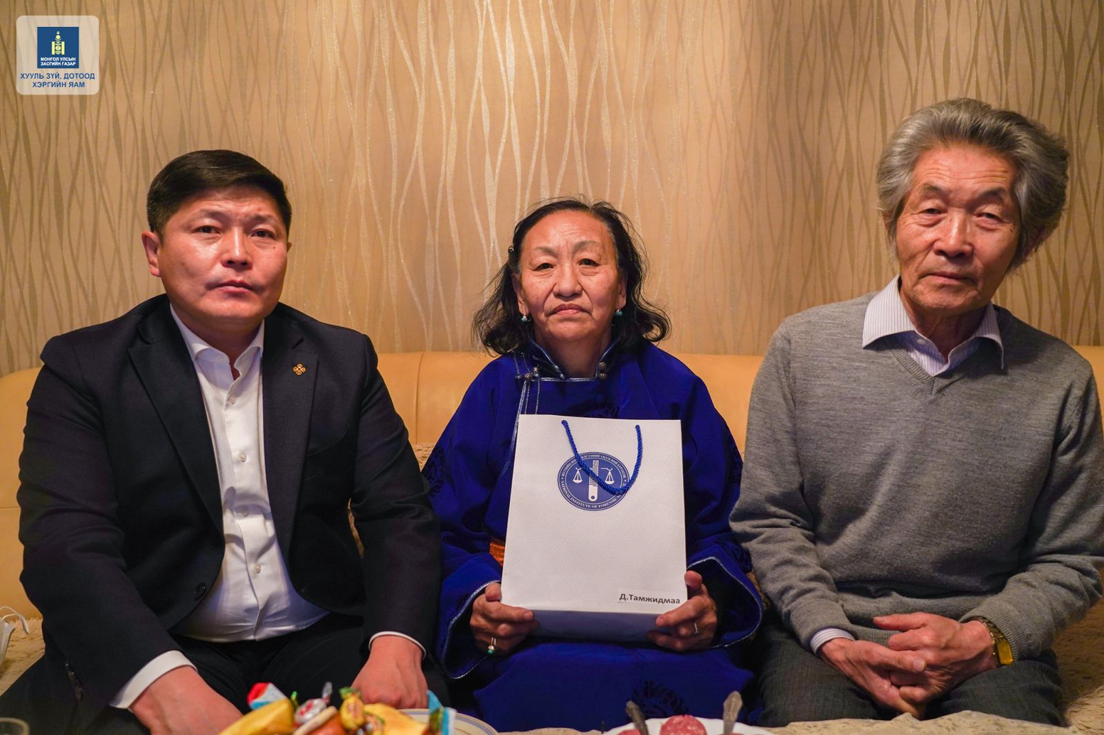 Түүний хөдөлмөр, зүтгэлийг үнэлж Хууль зүй, дотоод хэргийн сайдын хувиар хүндэтгэл үзүүлэн, 10 сая төгрөгийн мөнгөн дэмжлэгийг өөрийн биеэр гардуулж өглөө.