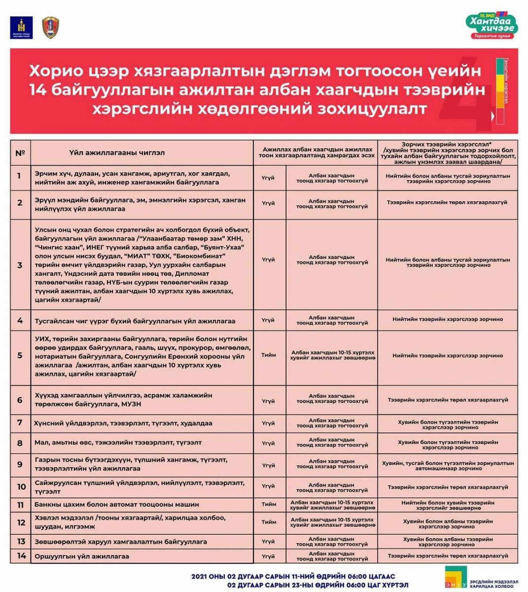 Дөрөвдүгээр түвшинд шилжсэн буюу Бүх нийтийн бэлэн байдлын хугацаанд 14 салбарын үйл ажиллагааг хязгаарлахгүй. Төрийн байгууллагын ажилтнууд нийтийн тээврээр үйлчлүүлэн ажилдаа ирж, очих бол мэдээлэл харилцаа холбоо, эмнэлэг, эмийн сан, хүнсний худалдаа, түгээлт болон оршуулгын зан үйл зэрэг хувийн хэвшлийн дөрвөн салбарын байгууллагын ажилтнуудын 10-15 хувь нь хувийн авто машинтайгаа хөдөлгөөнд оролцохыг зөвшөөрнө. Тухайн ажилтан, албан байгууллагын ажлын газрын тодорхойлолт, ажлын үнэмлэх болон иргэний үнэмлэхтэйгээ зорчих юм. Харин хүндэтгэн үзэх шалтгаантай, эрүүл мэндийн тусламж үйлчилгээ авах шаардлагатай иргэд хамгаалалтад гарч байгаа цагдаа, онцгой байдлын албан хаагчдад хандаж тусламж үйлчилгээг авах зохион байгуулалтыг хийсэн байна.