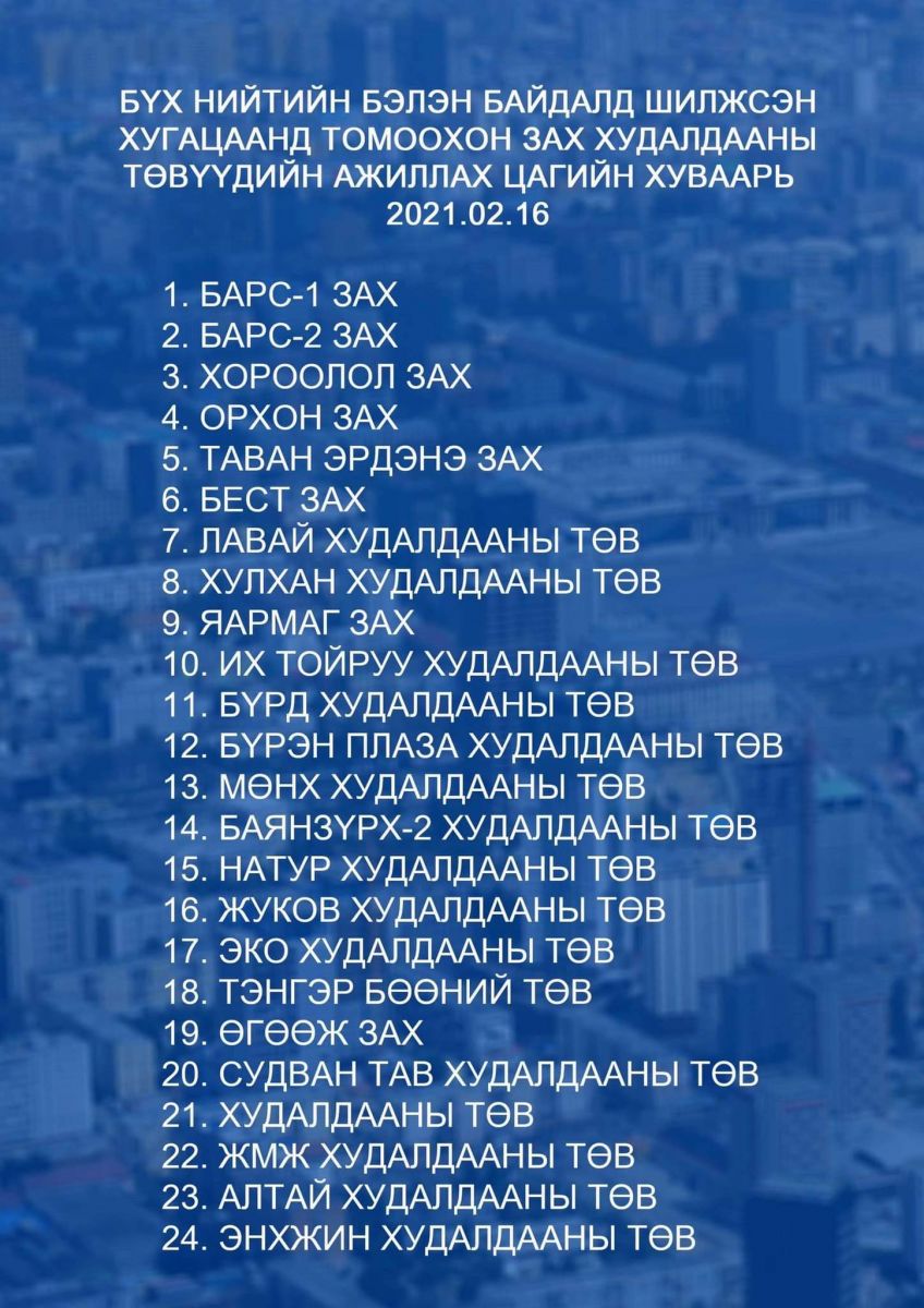 Улсын онцгой комисс хоёрдугаар сарын 16-24 хүртэл шат дараатай томоохон зах, худалдааны төвүүдийг нээхээр төлөвлөж байна.