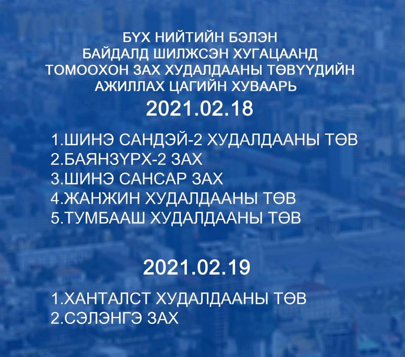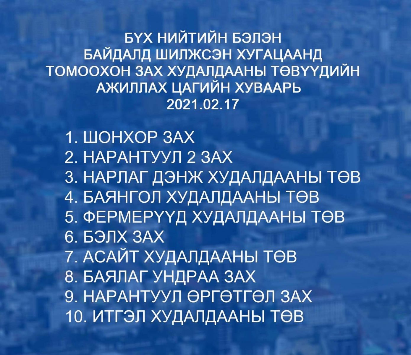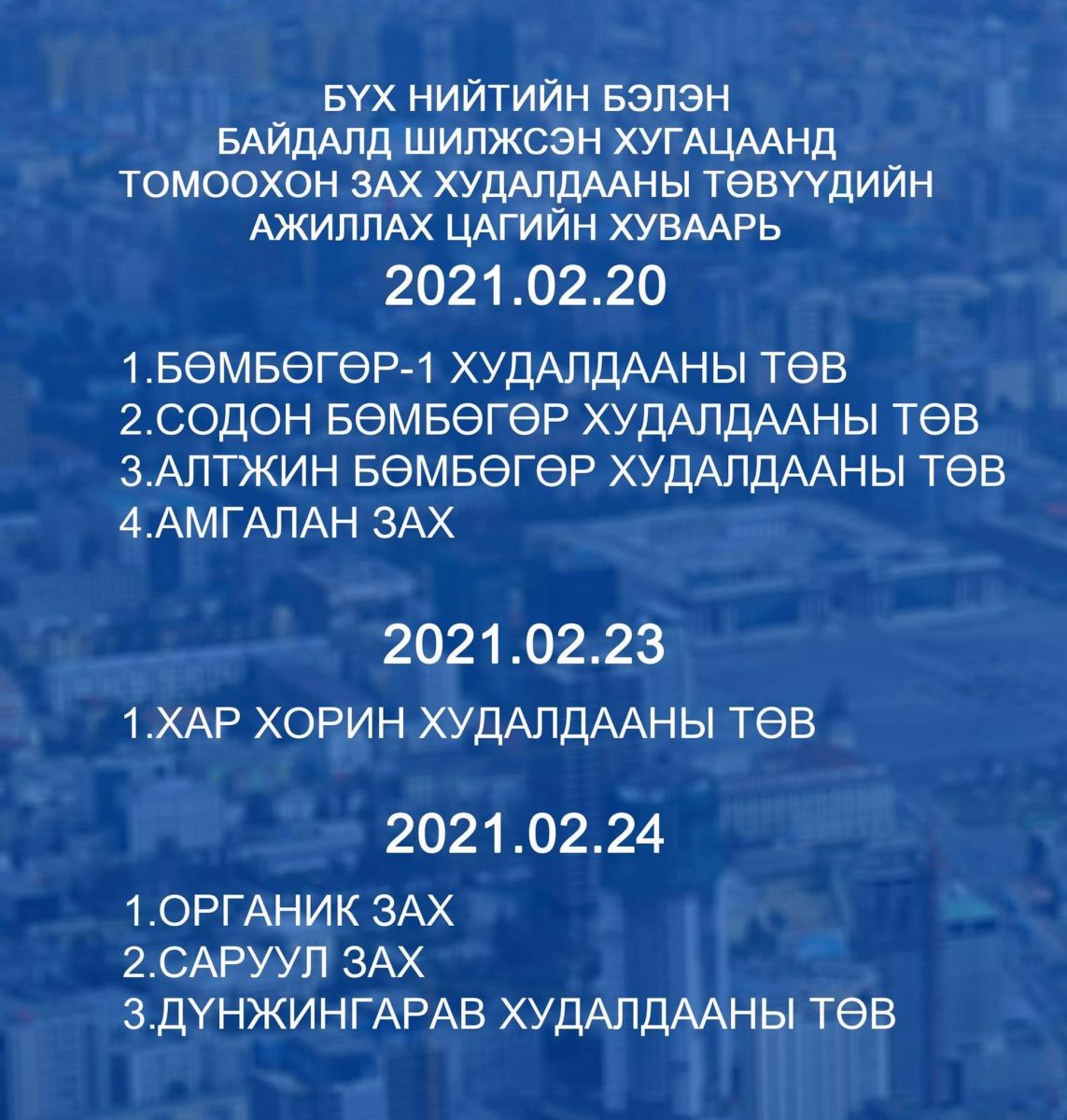 БҮХ НИЙТИЙН БЭЛЭН БАЙДАЛД ШИЛЖСЭН ХУГАЦААНД ТОМООХОН ЗАХ, ХУДАЛДААНЫ ТӨВҮҮДИЙН АЖИЛЛАХ ЦАГИЙН ХУВААРЬ