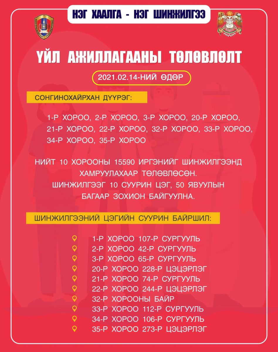 Ингээд "Нэг хаалга-Нэг шинжилгээ" аяны хүрээнд өнөөдөр /2021.02.14/ Сонгинохайрхан дүүргийн иргэдээс шинжилгээ авах тул хуваарийг та бүхэнд танилцуулж байна.