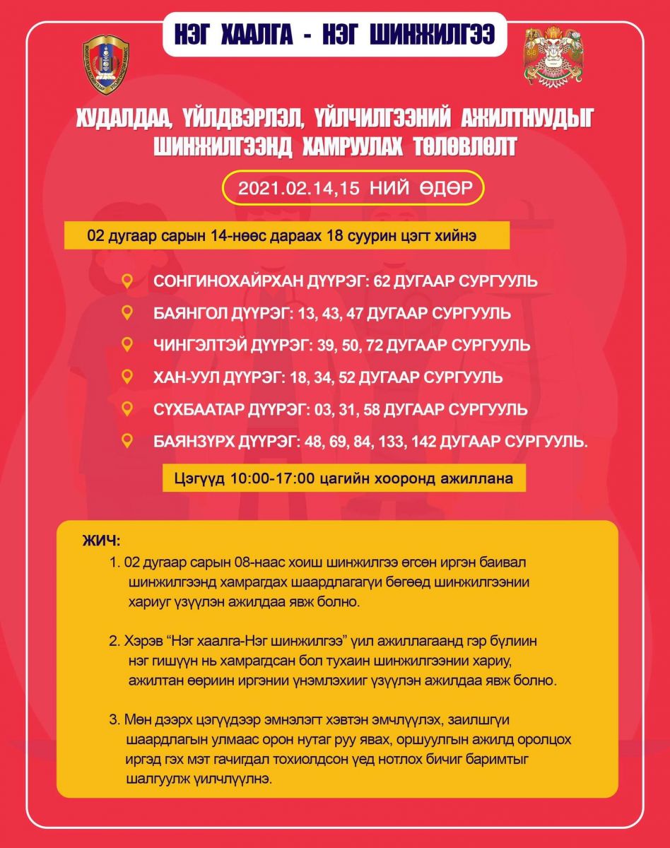 "Нэг хаалга- Нэг шинжилгээ" нэгдсэн арга хэмжээний хүрээнд хоёрдугаар сарын 14, 15-нд худалдаа үйлдвэрлэл, үйлчилгээний ажилтнуудыг шинжилгээнд хамруулахаар төлөвлөжээ. Шинжилгээний хуваарийг доорх зургаар харуулж байна.