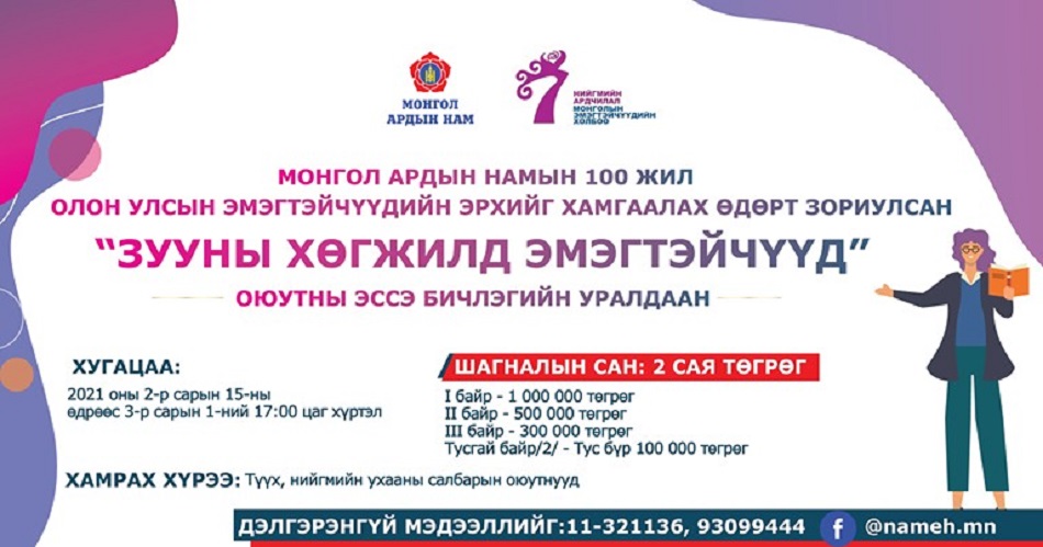 НАМЭХ-ноос Монгол Ардын Намын 100 жил, Олон улсын эмэгтэйчүүдийн эрхийг хамгаалах өдөрт зориулан “Зууны хөгжилд эмэгтэйчүүд” эссэ бичлэгийн уралдааныг 2021 оны хоёрдугаар сарын 15-наас гуравдугаар сарын 1-нийг хүртэл түүх, нийгмийн ухааны салбарын оюутнуудын дунд зохион байгуулж байна. Улс орны хөгжлийн 100 жилийн түүхэнд эмэгтэйчүүдийн оруулсан хувь нэмрийг сурталчлан таниулах, хүйсийн тэгш байдлын ач холбогдлыг ойлгуулах, эмэгтэйчүүдээ алдаршуулах зорилготой уг уралдааны шагналын сан 2 000 000 /Хоёр сая/ төгрөг юм байна.