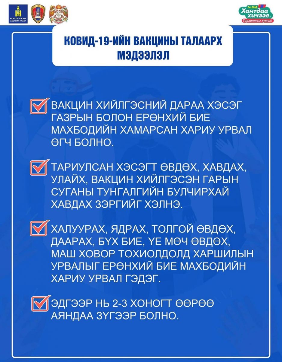 Өнөөдрийн байдлаар Дэлхийн эрүүл мэндийн байгууллага БНСУ-ын SKBio, БНЭУ-ын Serum Institute of India компанид үйлдвэрлэсэн AstraZeneca, Германы “BioNTech”, Америкийн “Pfizer” компаниудын хамтран бүтээсэн вакцинд тус тус зөвшөөрөл олгосон. Эдгээр вакциныг Монгол улс Ковакс хөтөлбрийн хүрээнд хүрээнд авах бөгөөд хүн амынхаа 20 хувь буюу 690 гаруй мянган хүнийг гуравдугаар сараас дархлаажуулахаар төлөвлөсөн.