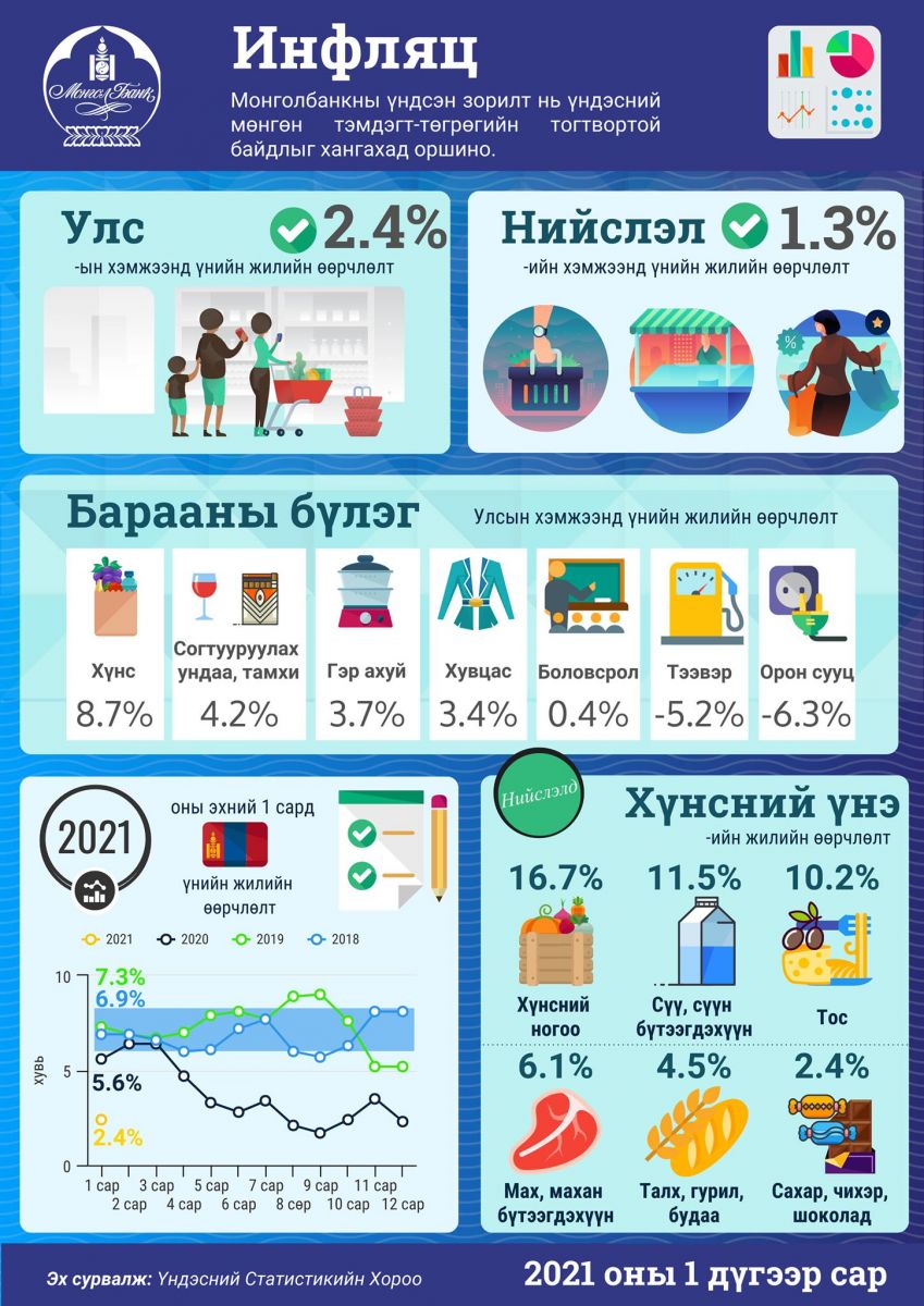 Инфляцын түвшин 2021 оны нэгдүгээр сард улсын хэмжээнд 2.4 хувь гарсны 2.2 нэгж буюу 91.7 хувь нь хүнсний бараа, ундаа, усны бүлгийн үнийн өсөлтөөс шалтгаалсан байна.
