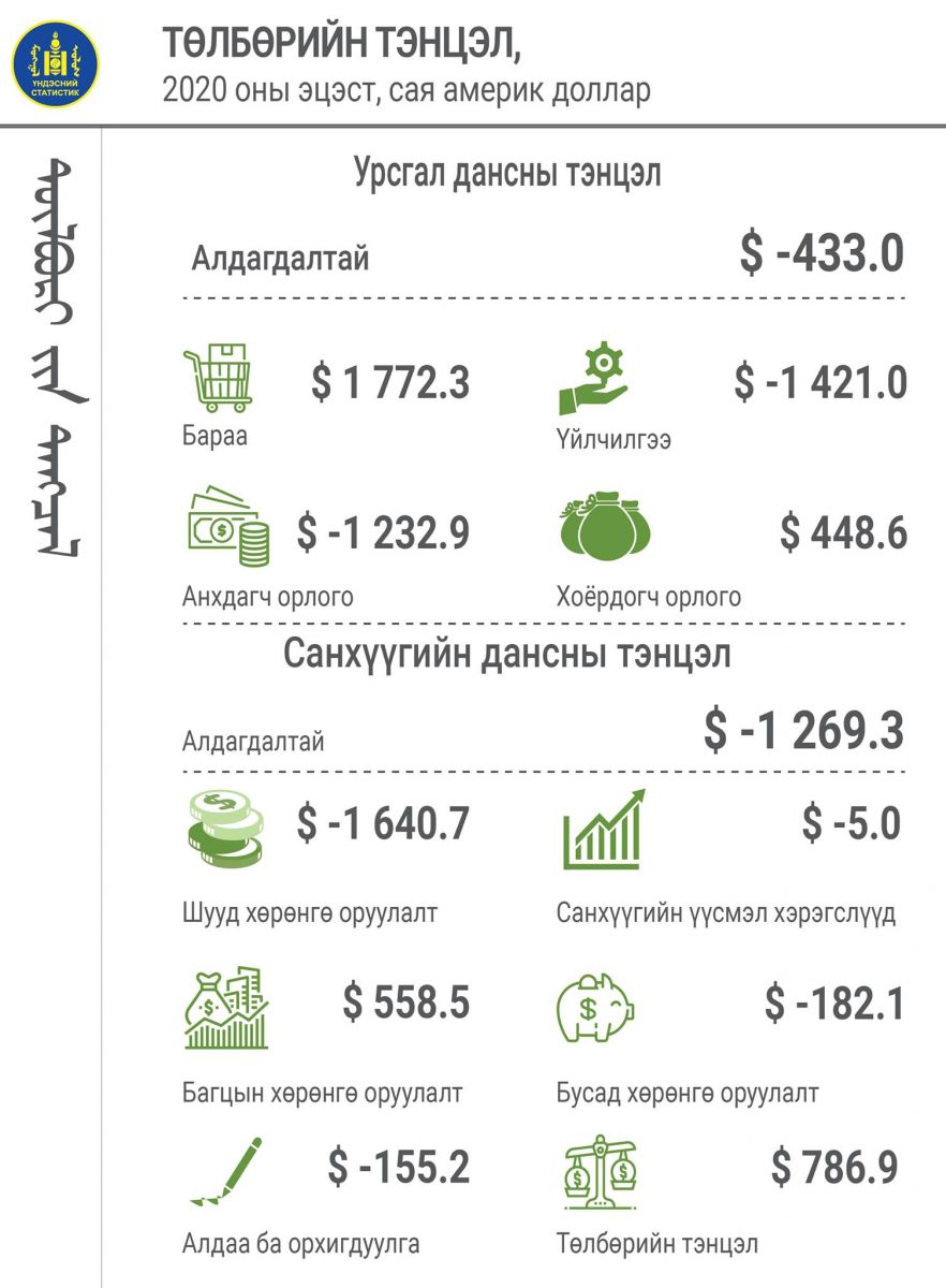 Төлбөрийн тэнцэл 2019 онд 452.9 сая ам.долларын ашигтай байсан бол 2020 оны урьдчилсан гүйцэтгэлээр өмнөх оноос 334 сая ам.доллароор өсөж, 786.9 сая ам.долларын ашигтай байна. Арванхоёрдугаар сарын тухайд төлбөрийн тэнцэл 777.6 сая ам.долларын ашигтай гарч, өмнөх сараас 474 сая ам.доллароор өсжээ.