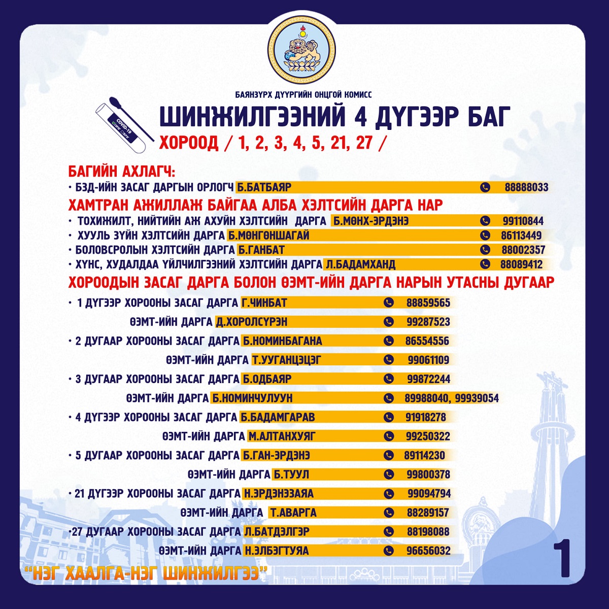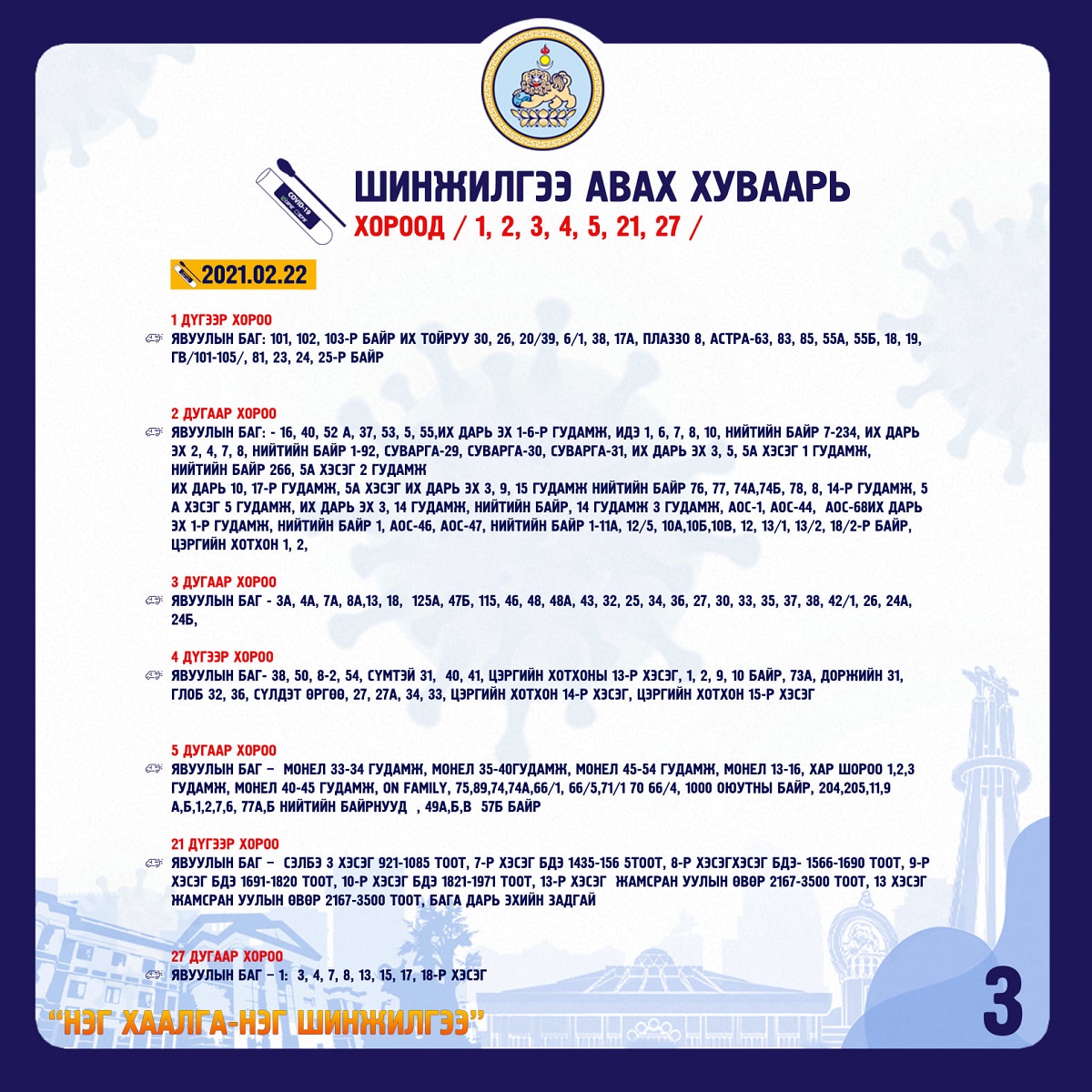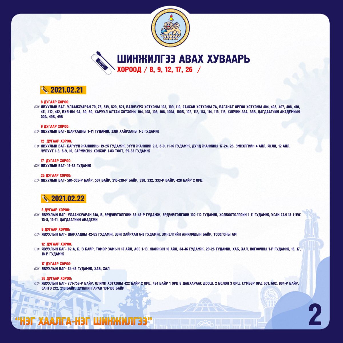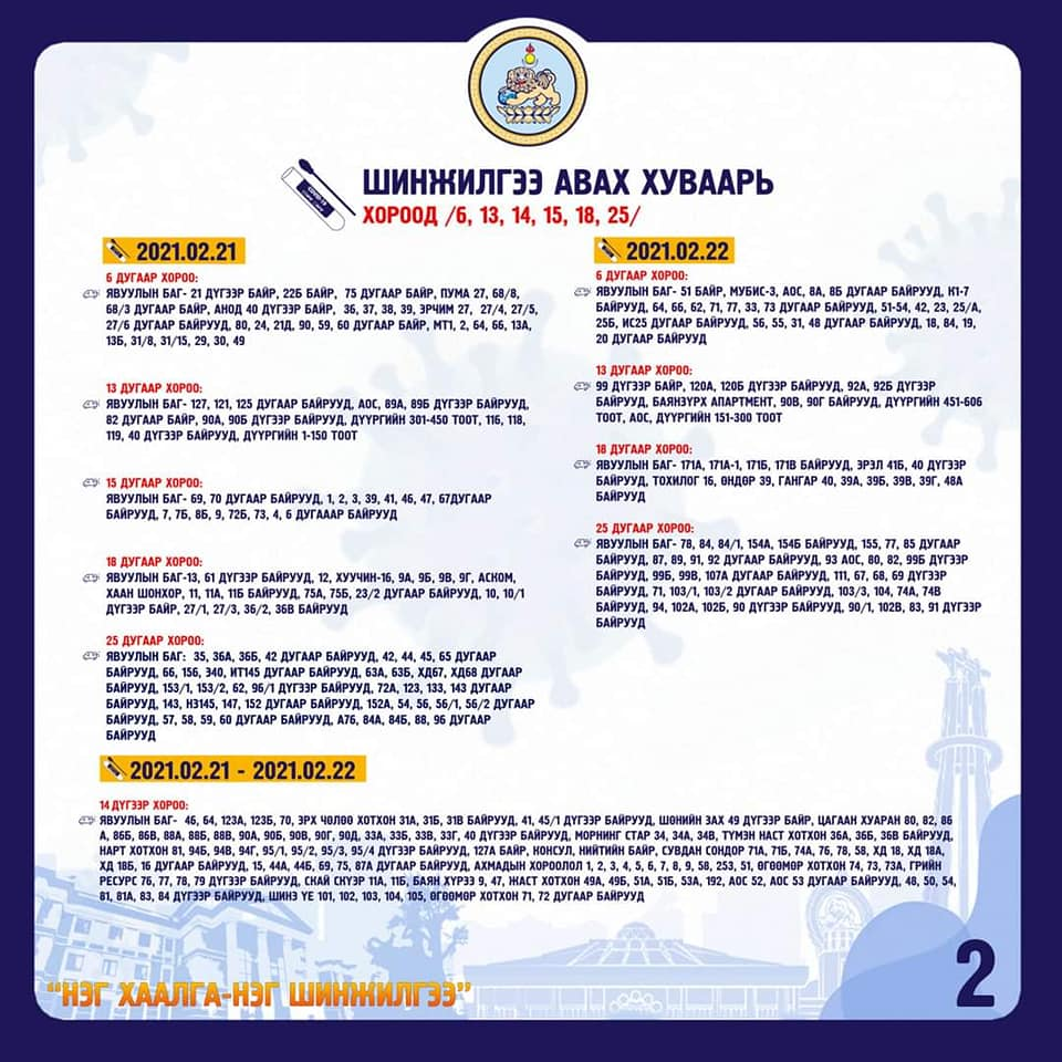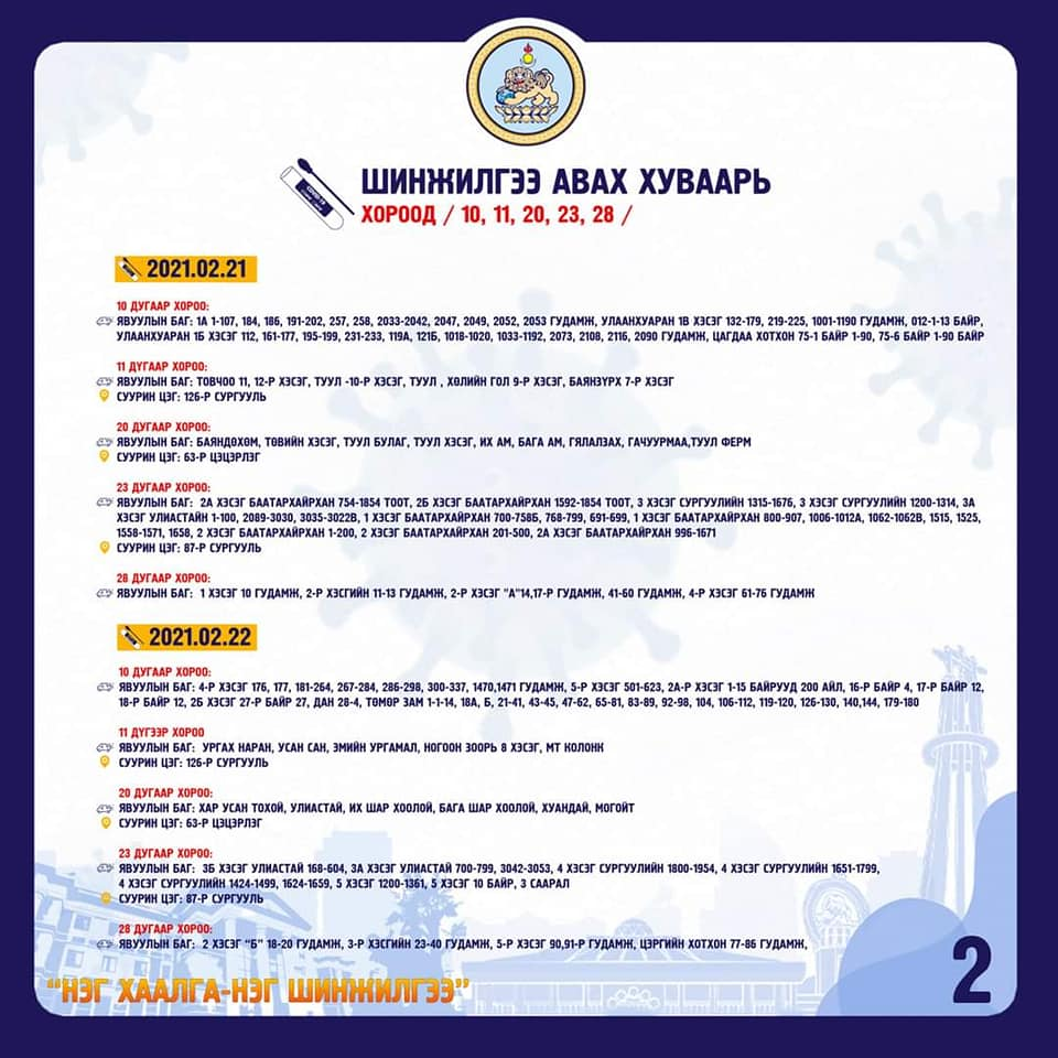“НЭГ ХААЛГА-НЭГ ШИНЖИЛГЭЭ” арга хэмжээ хуваарийн дагуу 2021.02.21, 22-нд БЗД-т зохион байгуулагдана. Шинжилгээнд хоёрдугаар сарын 8-наас хойш шинжилгээнд хамрагдаагүй 45800 өрхийн иргэнээс шинжилгээ авахаар төлөвлөж, бэлтгэл ажлаа хангажээ.