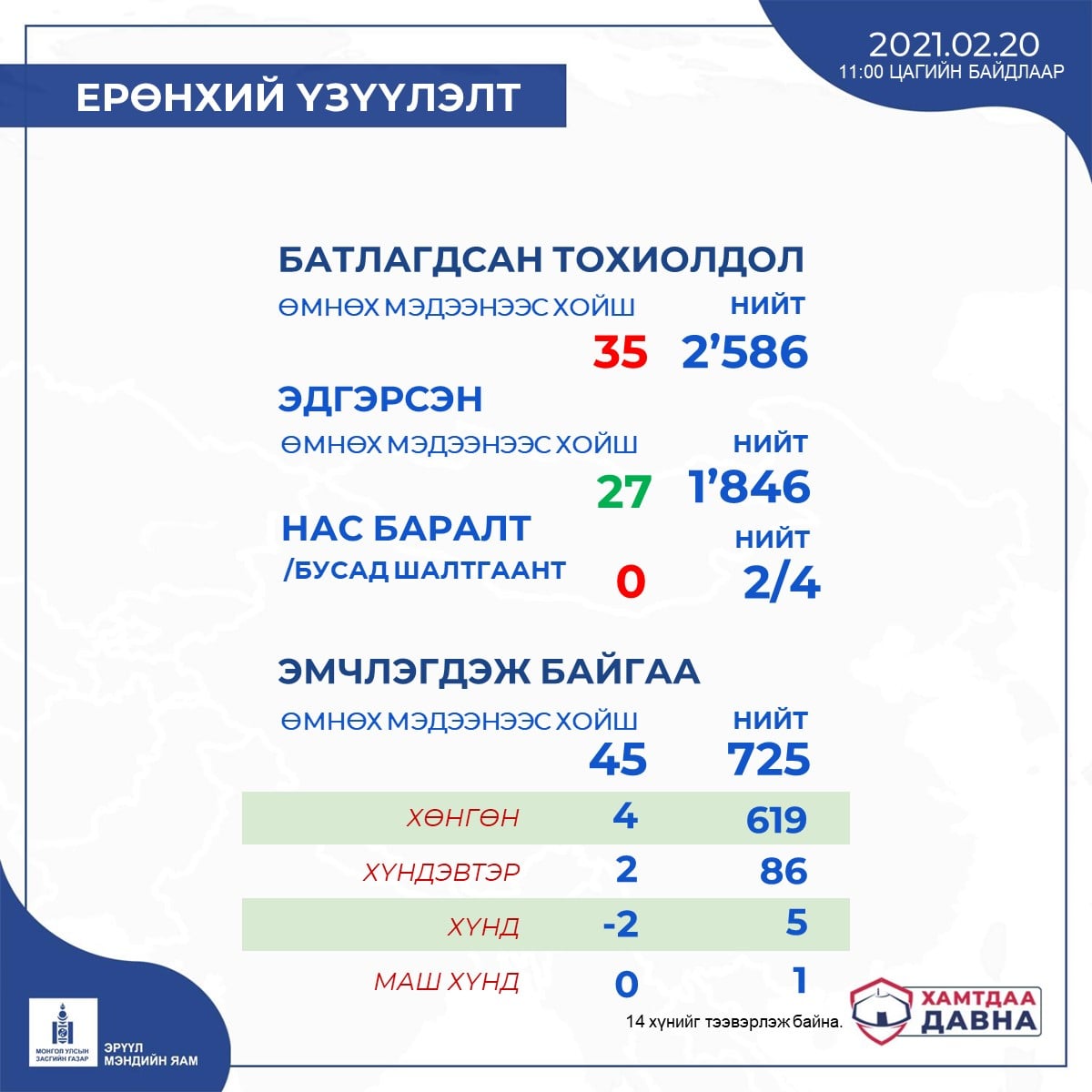 Монгол Улсын тухайд коронавирусний халдварын статистик дараах байдалтай байна.