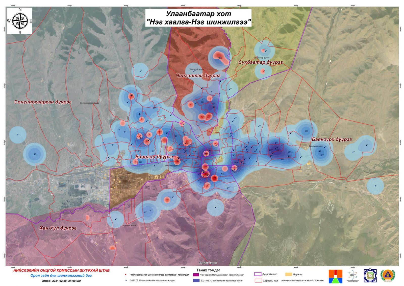 Дээрх зурагт улаан өнгөөр “Нэг хаалга-Нэг шинжилгээ” нэгдсэн тандалт, илрүүлгийн арга хэмжээний хүрээнд илэрсэн 68 тохиолдол болон түүний идэвхжилт, цэнхэр өнгөөр 2021 оны хоёрдугаар сарын 10-18-ны өдрүүдэд батлагдсан Ковид-19 халдварын өндөр эрсдэл бүхий орон зайн тооцооллыг харуулж байна.