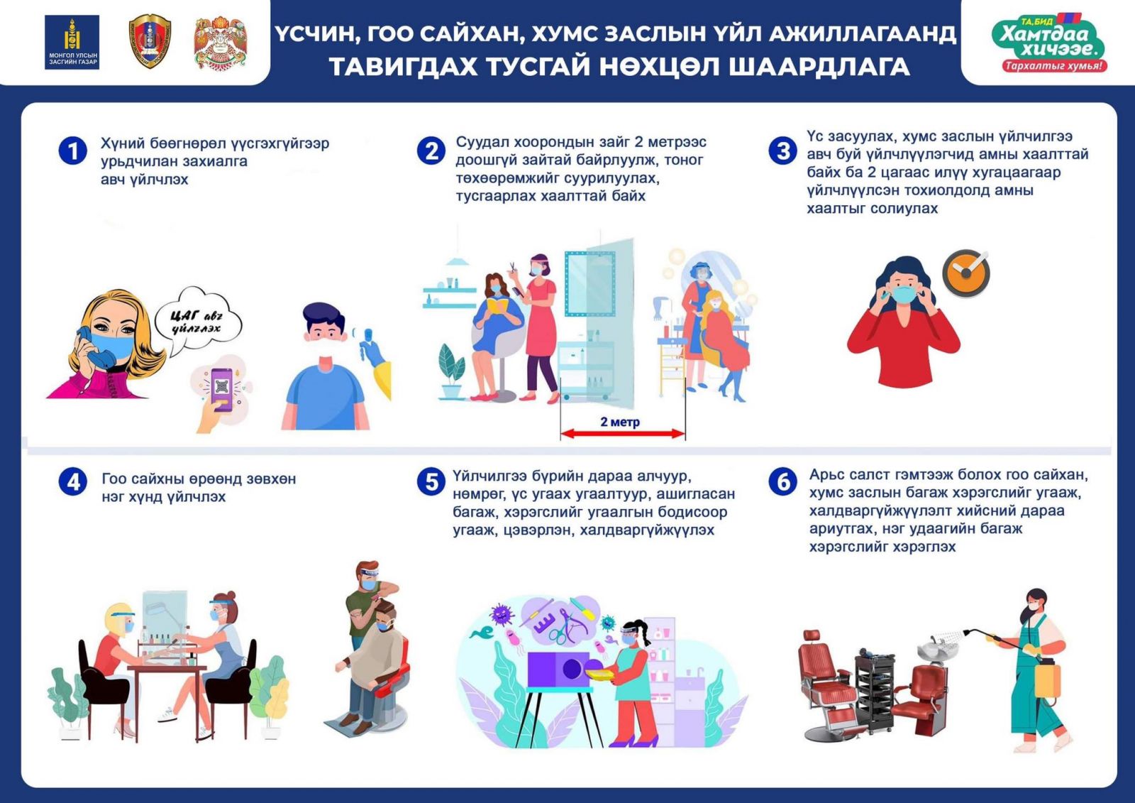 - Үс засуулах, хумс заслын үйлчилгээ авч буй үйлчлүүлэгчид амны хаалттай байх ба 2 цагаас илүү хугацаагаар үйлчлүүлсэн тохиолдолд амны хаалтыг солиулах