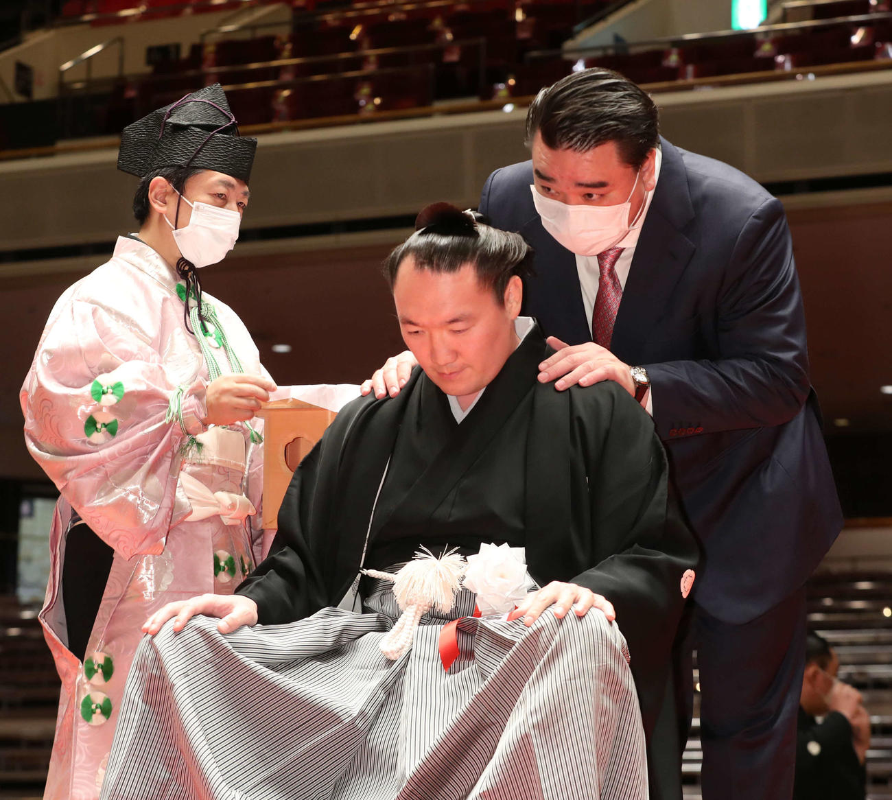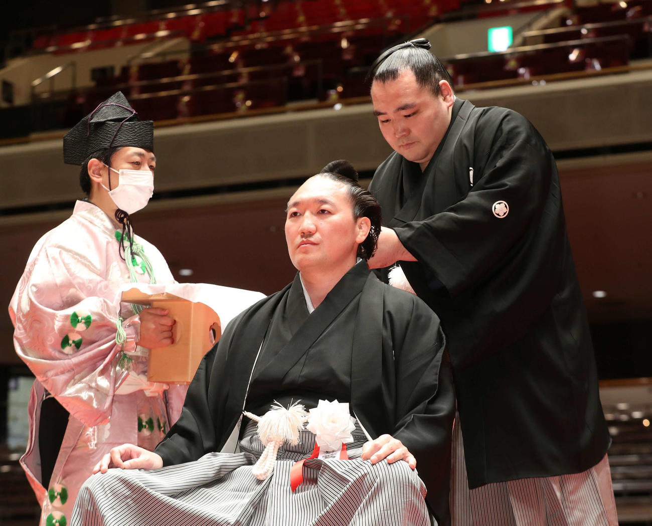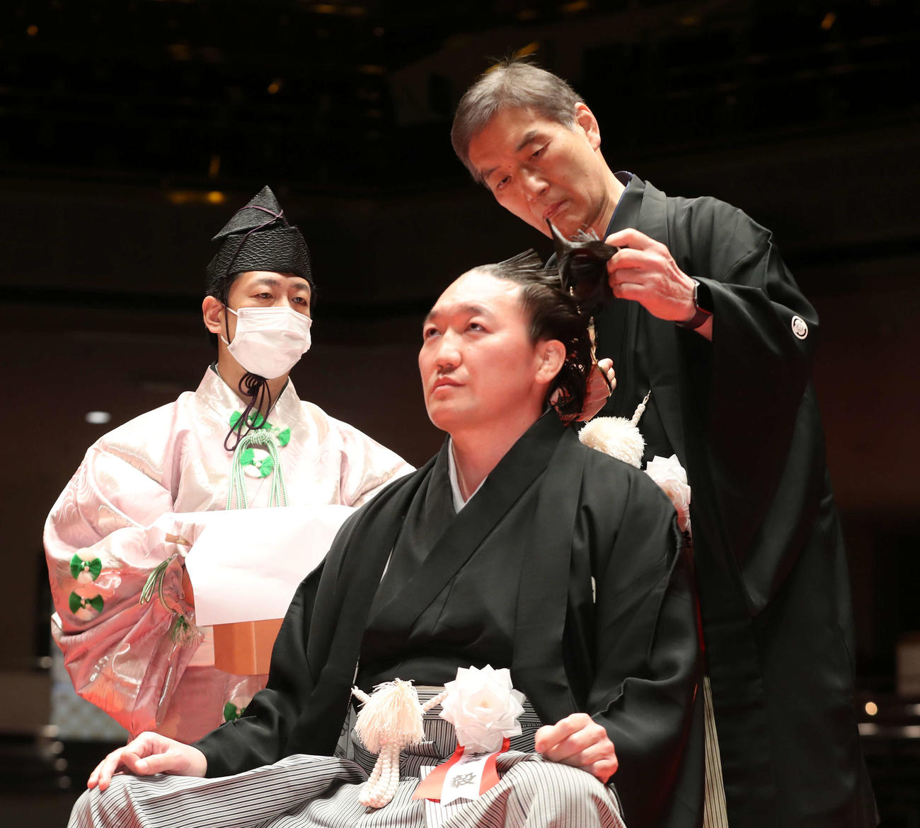 Минэзаки ояката болон ёкозүна Какүрюү, Харүмафүжи нар үсэнд нь хайч хүргэж, Араваши сүмо бөхийн замналаа албан ёсоор төгсгөлөө.