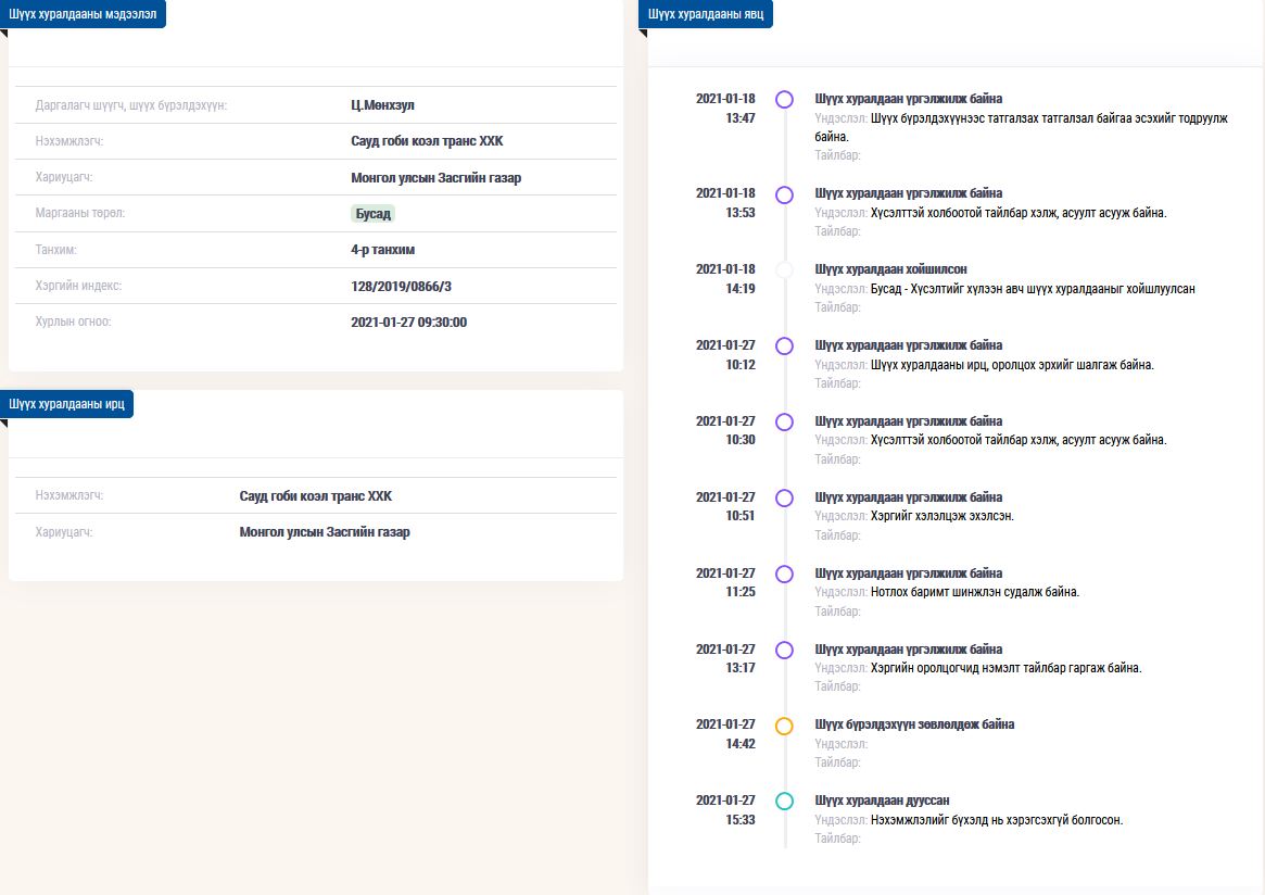 Харин хоёр тусгай зөвшөөрлөө цуцлуулсан "Сауд Гоби Коэл транс" компани Засгийн газрын шийдвэрийг эсэргүүцэж, шүүхэд хандан 130 тэрбум төгрөг Засгийн газраас нэхэмжлээд байсан юм. Тэгвэл "Сауд Гоби Коэл Транс" ХХК-ийн нэхэмжлэлийг нийслэл дэх Захиргааны хэргийн анхан шатны 2021 оны 1 дүгээр сарын 27-нд хэлэлцээд, нэхэмжлэлийг бүхэлд хэрэгсэхгүй болгож шийдвэрлэсэн байна.