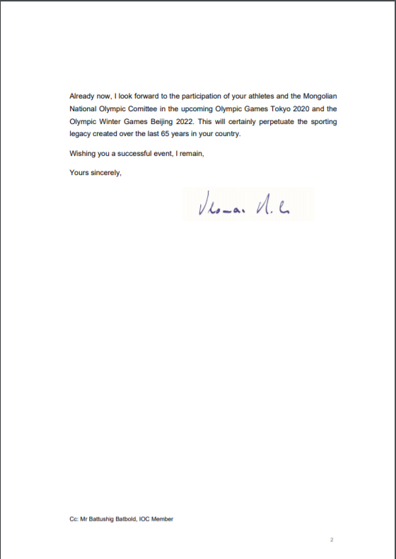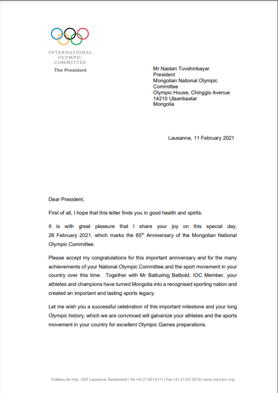 Эх орондоо олимпийн хөдөлгөөнийг өрнүүлэн, тамирчдаа уриалан дуудаж, олимпийн наадамд өрсөлдөхөөр гаргуун сайн бэлтгэл сургуулилт хийж буйд ОУОХ сэтгэл ханамжтай байгаа бөгөөд та бүхэн түүхт ойгоо ёслол төгөлдөр тэмдэглэн өнгөрүүлэхийг хүсье.