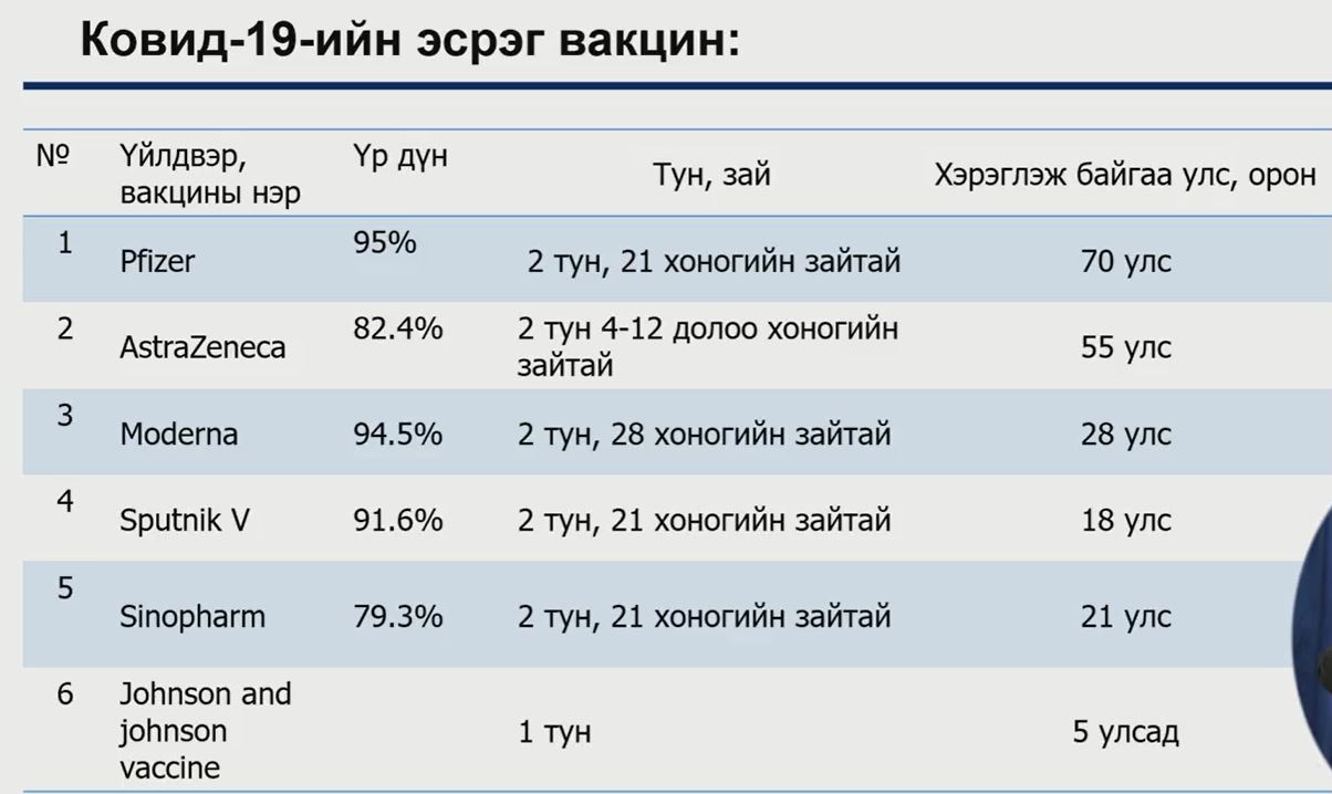 Нэгдүгээрт Pfizer вакцин. Энэ нь шинэ технологи буюу эрникад суурилсан вакцин бөгөөд 2 тунгаар 21 хоногийн хугацаатай хийж байгаа. Өнөөдрийн байдлаар дэлхий дахины 70 улс оронд энэ вакциныг хэрэглэж, эхний үр дүнгүүд гарч байна.