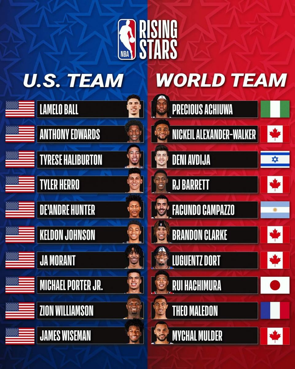 АНУ-ын шигшээ баг: Зайон Уильямсон (Шинэ Орлеан), Жа Морэнт (Мемфис), Ламело Болл (Шарлотт), Энтони Эдвардс (Миннесота), Тайриз Халибертон (Сакраменто), Тайлер Хирро (Майами), Де′Андре Хантер (Атланта), Келдон Жонсон (Сан-Антонио), Майкл Портер (Денвер), Жеймс Уайзмен (Голден Стэйт).