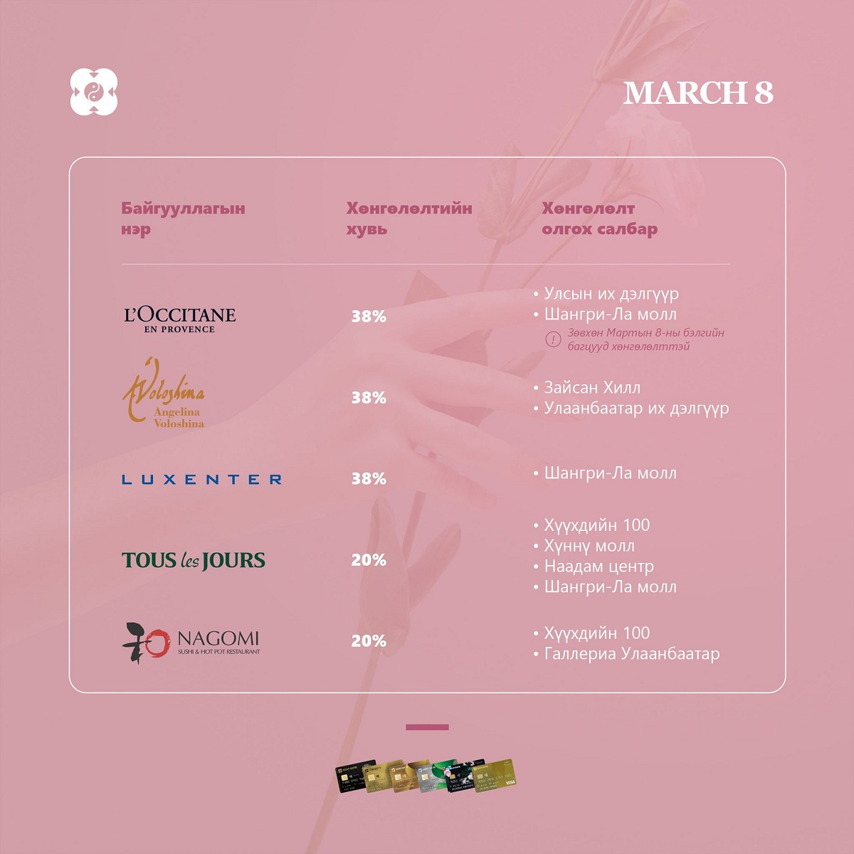 Олон улсын эмэгтэйчүүдийн баярыг тохиолдуулан ХААН Банк дараах нэр бүхий картаар худалдаа үйлчилгээний зарим байгууллагаар үйлчлүүлж, хөнгөлөлт эдлэх боломжийг олгож байна. Эрхэм харилцагч та 3-р сарын 5-8-ны өдрүүдэд ХААН Банкны картаараа худалдаа үйлчилгээний дараах байгууллагуудад 20-38% хөнгөлөлттэй үнээр үйлчлүүлээрэй.