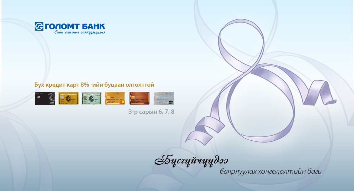 Олон улсын эмэгтэйчүүдийн баярын өдрийг тохиолдуулан Голомт банкнаас буцаан олголттой, урамшуулалтай худалдан авалтыг харилцагчдадаа санал болгож байна.