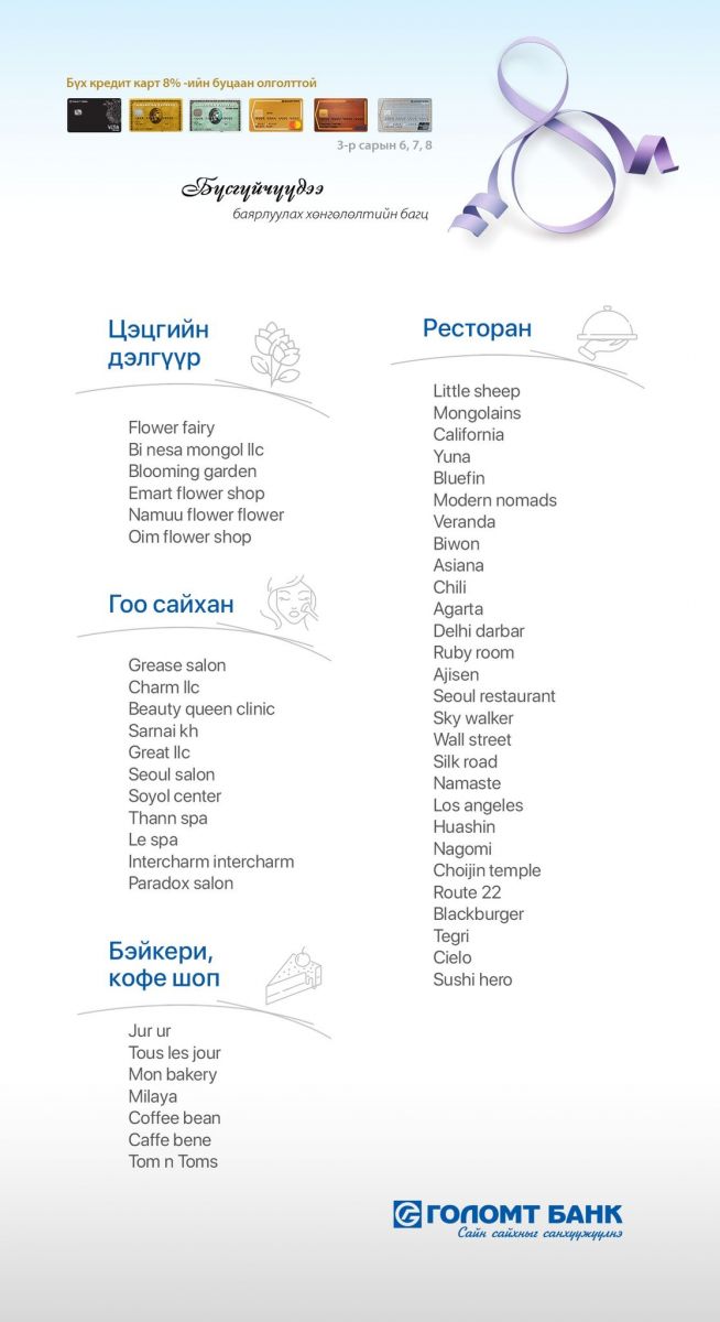 Тухайлбал, тэмдэглэлт баярын өдрөөр харилцагч та халамжит хань, гэр бүл, хайртай хүмүүстээ зориулан бидний хамтран ажилладаг Tous les jour, Жүр үр зэрэг 10 гаруй бялуу, нарийн боовны бүтээгдэхүүн үйлчилгээнээс сонголтоо хийж, Mongolians, Sky Walker, Wallstreet, Yuna зэрэг тохь тухтай дээд зэргийн 30 орчим зоогийн газраас сонгон үйлчлүүлж үсчин, гоо сайханд алжаалаа тайлан, хайртай хүндээ цэцгийн баглаагаар бэлэг бариарай.