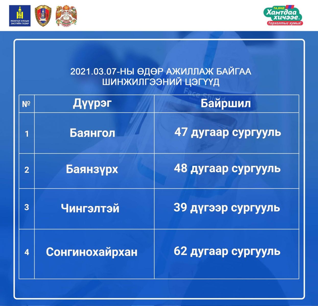 Өнөөдөр /2021.03.07/ нийслэлийн дөрвөн дүүрэгт шинжилгээ авч байна. Тухайлбал, Баянгол дүүргийн 47 дугаар сургууль, Баянзүрх дүүргийн 48 дугаар сургууль, Чингэлтэй дүүргийн 39 дүгээр сургууль болон Сонгинохайрхан дүүргийн 62 дугаар сургууль дээр иргэдээс шинжилгээ авах ажлыг зохион байгуулж байна.