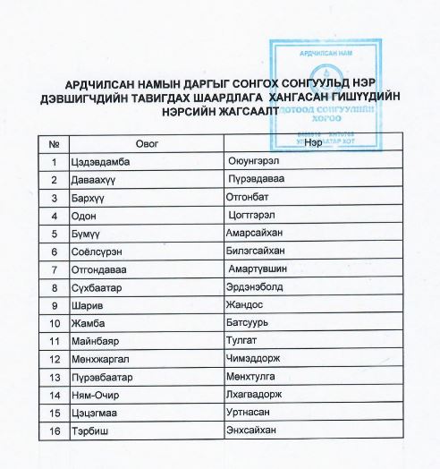 Түүнчлэн нэг нэр дэвшигч нэрээ татсан нь өмгөөлөгч О.Алтангэрэл ажээ.