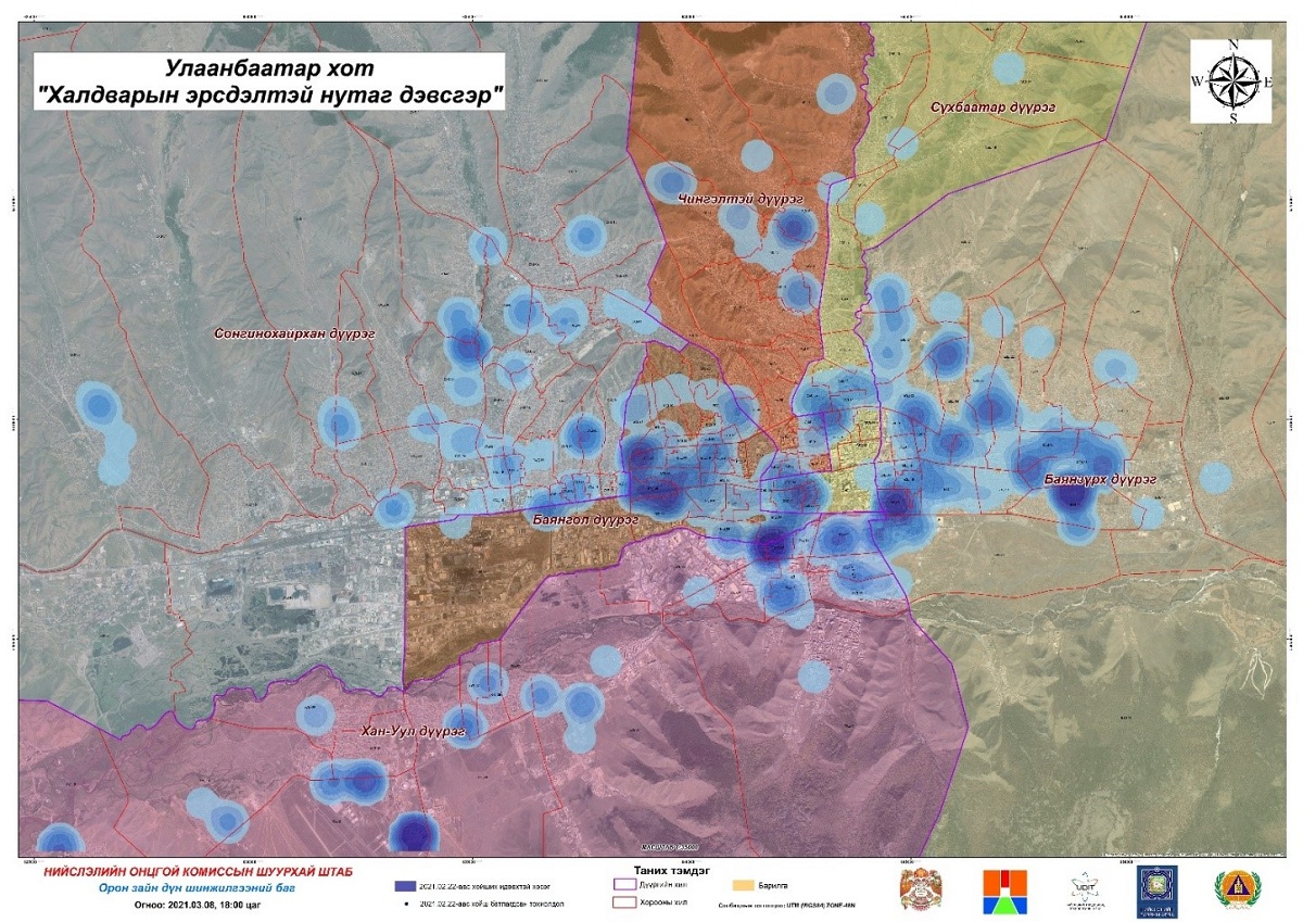 Нийслэлийн Онцгой комиссын Шуурхай штабын Орон зайн дүн шинжилгээний багийнхан илэрсэн халдварын тохиолдлуудыг мэдээллийн санд бүртгэж, тусгай аргачлалаар халдварын эрсдэлийн тархалт, нягтрал, чиг хандлагыг тооцоолж байгаа. Өмнөх сард хийсэн дүн шинжилгээтэй шинээр батлагдаж буй тохиолдлууд 90 гаруй хувиар таарч байна. Орон зайн дүн шинжилгээгээр цаашид коронавирусийн халдвар илрэх магадлал өндөр хороодыг танилцуулъя.