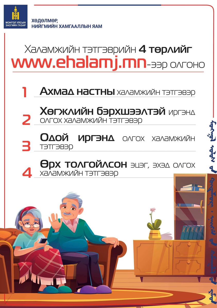 Тэгвэл өчигдрөөс Нийгмийн халамжийн сангаас олгодог Ахмад настны тэтгэвэр, Хөгжлийн бэрхшээлтэй иргэнд олгох тэтгэвэр, Одой иргэнд олгох тэтгэвэр, Өрх толгойлсон эцэг, эхэд олгох халамжийн тэтгэврийг тус системээр дамжуулан олгох боломжтой боллоо. Ингэснээр нийт 10 төрлийн халамжийн үйлчилгээг цахим системээр дамжуулан олгох нөхцөл бүрдлээ.