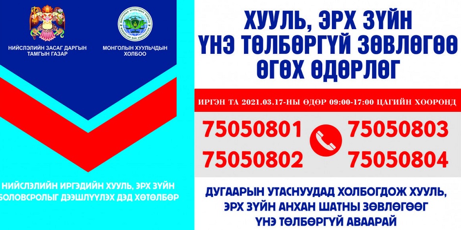 Энэ сарын өдөрлөг 2021 оны гуравдугаар сарын 17-ны 09:00-17:00 цагийн хооронд үргэлжилнэ. Иргэн та 75050801, 75050802, 75050803, 75050804 дугаарын утсанд холбогдож хууль, эрх зүйн зөвлөгөө, мэдээлэл авах боломжтой.