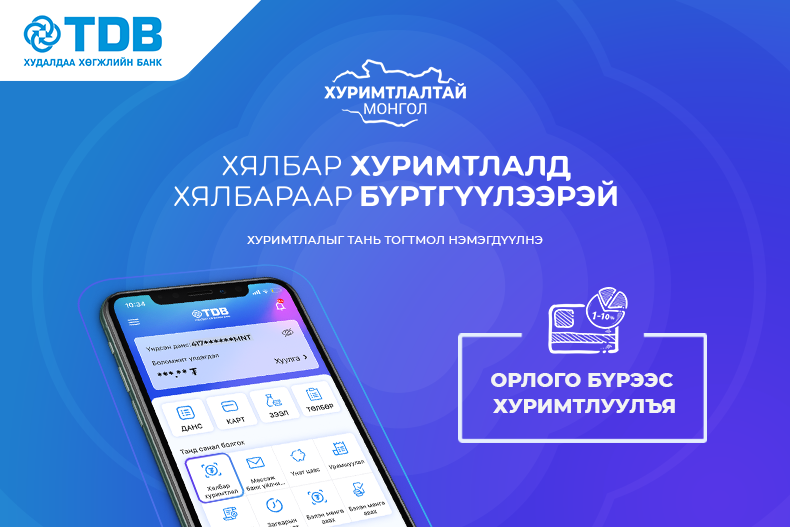 Хэрэв та хуримтлалгүй бол яг одоо TDB Online үйлчилгээ ашиглан онлайнаар хадгаламжийн данс нээж, Хялбар хуримтлал үйлчилгээнд бүртгүүлээрэй. Харин хуримтлалтай бол Хялбар хуримтлал үйлчилгээнд нэмж бүртгүүлэхээ битгий мартаарай. Танд ямар ч санхүүгийн дарамтгүйгээр хуримтлал тань өсөх болно. Хялбар хуримтлал үйлчилгээний талаарх дэлгэрэнгүй мэдээллийг ЭНД дарж авна уу.
