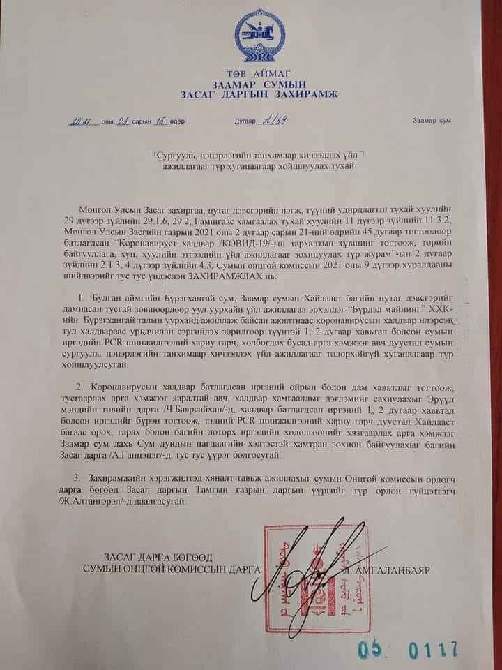Болсон явдлыг нэгэнт нуух аргагүй тул Төв аймгийн Заамар сумын Засаг дарга Л.Амгаланбаяр өчигдөр /2015.03.15/ А/59 тоот захирамж гаргажээ. Захирамжид Булган аймгийн Бүрэгхангай сум болон Төв аймгийн Заамар сумын Хайлааст багийн нутаг дэвсгэрийг дамнасан газар нутагт уул уурхайн чиглэлээр үйл ажиллагаа явуулдаг "Бүрдэл майнинг" ХХК-ийн уурхайн ажилтнаас коронавирусний халдвар илэрсэн гэдгийг тодотгож өгсөн байна.