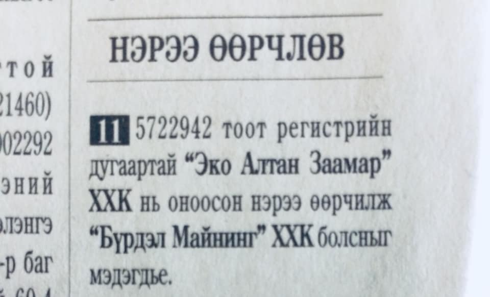 Үүнээс улбаалж тус компанийнхан "Эко алтан заамар" нэрээ өөрчилж, "Бүрдэл майнинг" болгосон.