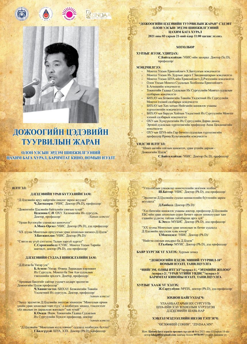 Хэл зохиолын хүрээлэн, Улаанбаатарын их сургуулиас хамтран “Дожоогийн Цэдэв туурвил зүйн жаран” олон улсын эрдэм шинжилгээний цахим бага хурал, баримтат кино, номын нээлтийн арга хэмжээг зохион байгуулна.