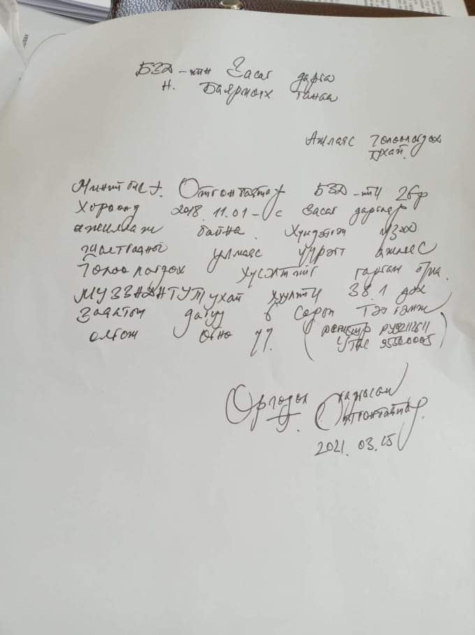 Хорооны Засаг даргаар 2018 оны арваннэгдүгээр сарын 1-нээс эхлэн ажилласан тэрбээр хүндэтгэн үзэх шалтгааны улмаас үүрэгт ажлаас чөлөөлөгдөх тухай хүсэлтдээ 6 сарын тэтгэмж олгож өгөхийг хүссэн байгаа нь өөрийнх нь бичсэн дараах хүсэлтээс харагдаж байна.