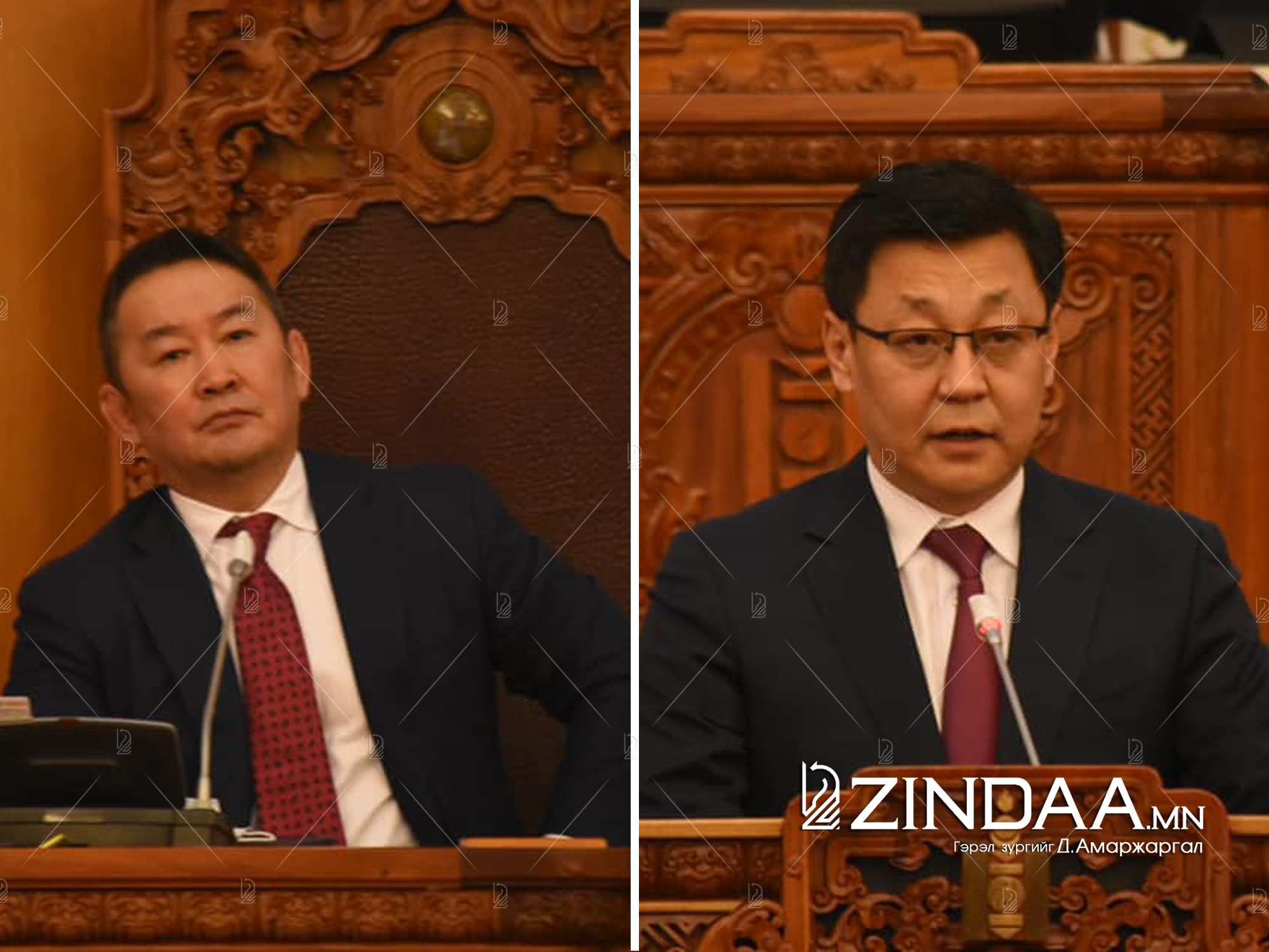 Тэгвэл Ерөнхий сайд Ж.Эрдэнэбатыг УИХ-ын гишүүнийхээ тангарыг өргөх үеэр Ерөнхийлөгч Х.Баттулга чуулганы танхимд түүнд хандаж үг хэлсэн билээ. Тэрбээр “Ж.Эрдэнэбат аа, хэрэг тань мөрдөн байцаалтын шатанд явж байхад яаран сандран тангараг өргөх хэрэг байна уу. Азнавал яасан юм. Тэртэй тэргүй парламентын гишүүдийн тал нь гэмт хэрэгтнүүд байгаа. Ж.Эрдэнэбат өөрөө нэгийг бодно биз. Хар залуугаараа аймгийн Засаг дарга, Сангийн сайд, Ерөнхий сайд болсон хүн. Энэ эмгэнэлт жүжиг болох гээд байна шүү. Тэртэй тэргүй УИХ шүүхийг авсан. Та нар олонх байна, санаа зовох зүйлгүй. Хэргээ нэг тийш болгочихоод тангаргаа өргөж болдоггүй юм уу. Би дахиад хэлье, энэ УИХ бага ард түмэн биш болсон” гэх үгийг парламентын индрээс тодотголоо. Улмаар Ж.Эрдэнэбатыг тангараг өргөхийг эсэргүүцэж, Ерөнхийлөгч Х.Баттулга болон УИХ дахь АН-ын бүлгийн гишүүд чуулганы танхимыг орхин гарсан байдаг.