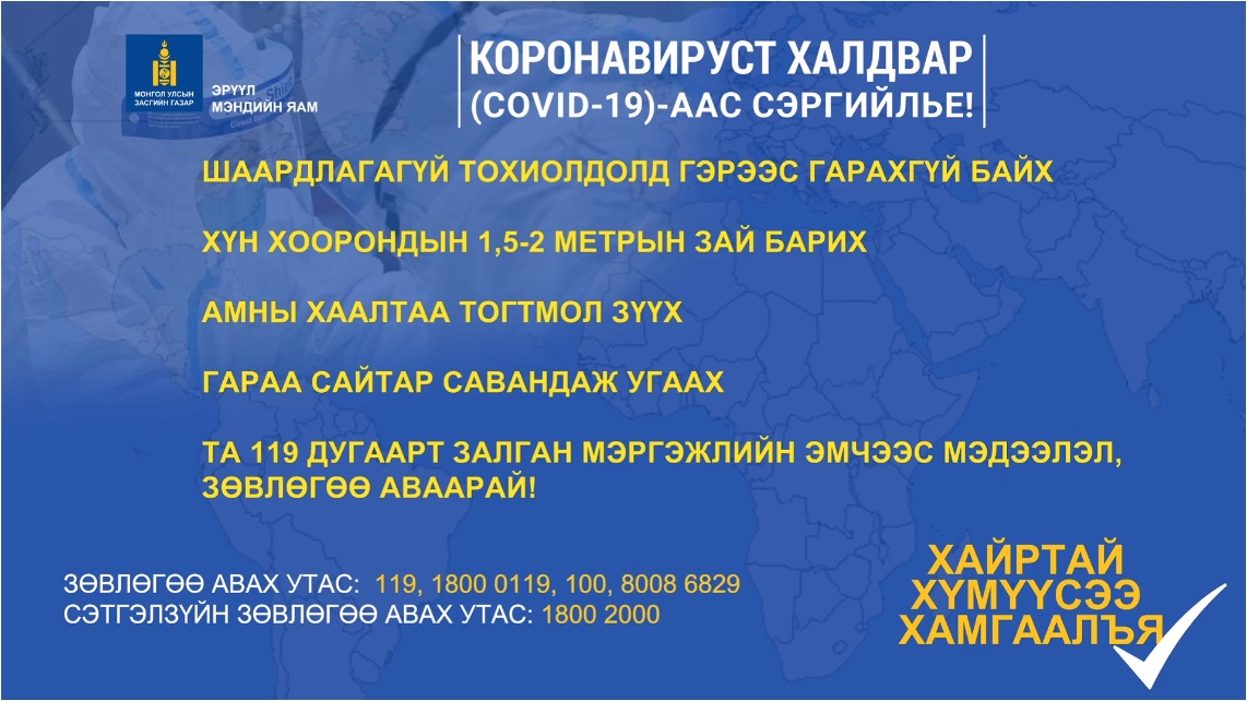 Өчигдрийн мэдээллээс хойш коронавируст халдварын шинээр бүртгэгдсэн 218 тохиолдлын 176 нь Улаанбаатарт бүртгэгдэж, нийслэлийн нийт өвчлөл 4650 боллоо. Зөөвөрлөгдсөн тохиолдол байхгүй. Аймаг, орон нутагт өнгөрсөн 24 цагт 42 тохиолдол шинээр бүртгэгдэж, өвчлөл 424 болж байна. Эдгээр нь Өвөрхангайд 27, Дархан-Уулд 10, Төв аймагт 5 байна.