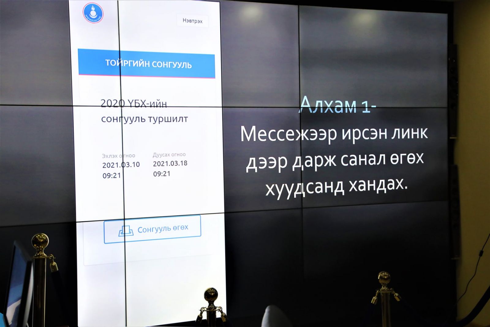 Тухайлбал, Дотоод сонгуулийн хорооноос мессэжээр илгээсэн холбоосоор дамжуулан вэб сайтаар нэвтэрч саналаа өгнө. Мөн 77331206 дугаар руу залгаж саналаа өгнө. Ардчилсан нам аппликейшнээр нэвтэрч санал өгөх боломжтойг танилцуулав. Цахим сонгуулийн санал хураалтын үеэр нэр дэвшигчид ажиглагчдаа оруулах боломжтойг мөн танилцуулав.