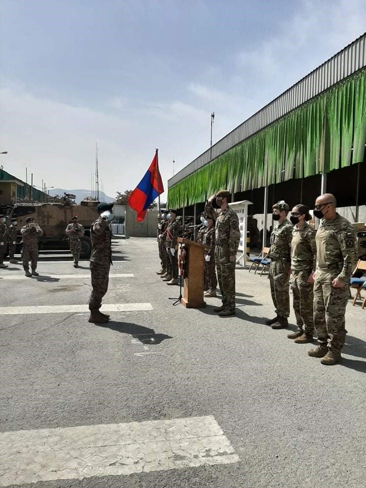 Мөн Кабулын аюулгүй байдлыг хангах хүчний командлагч, бригадын генерал Олли Браун “Шинэ Кабул Баазын аюулгүй байдлыг хангах үүргийг хүлээж буй Монгол Улсын Зэвсэгт хүчний цэргийн багийн бүрэлдэхүүний үүрэг гүйцэтгэлт, мэргэжлийн ур чадварт эргэлзэхгүй байна. Та бүхний явуулж байгаа цэргийн сургалт бэлтгэл бие бүрэлдэхүүний мэргэжлийн ур чадварыг дээшлүүлэх, үүрэг гүйцэтгэх чадавхыг нэмэгдүүлэхэд чиглэгдсэн байгааг олон удаа харлаа. Та бүхнийг үүрэг гүйцэтгэж байхад эвслийн цэргийн хүчний бүрэлдэхүүн тайван амарч байдаг. Өнөөдөр та бүхэнд “Умард Атлантын Гэрээний Байгууллага”-ын медалийг гардуулан өгч байгаадаа баяртай байна. Энэ бол та бүхний ажиллагааны газар оронд үүрэг гүйцэтгэж эхэлснээс өнөөдрийг хүртэл хийсэн зүйлийн тань үнэлэмж бөгөөд цаашид албаа нэр төртэй хаах урамшуулал юм” гээд баярын мэнд хүргэлээ.