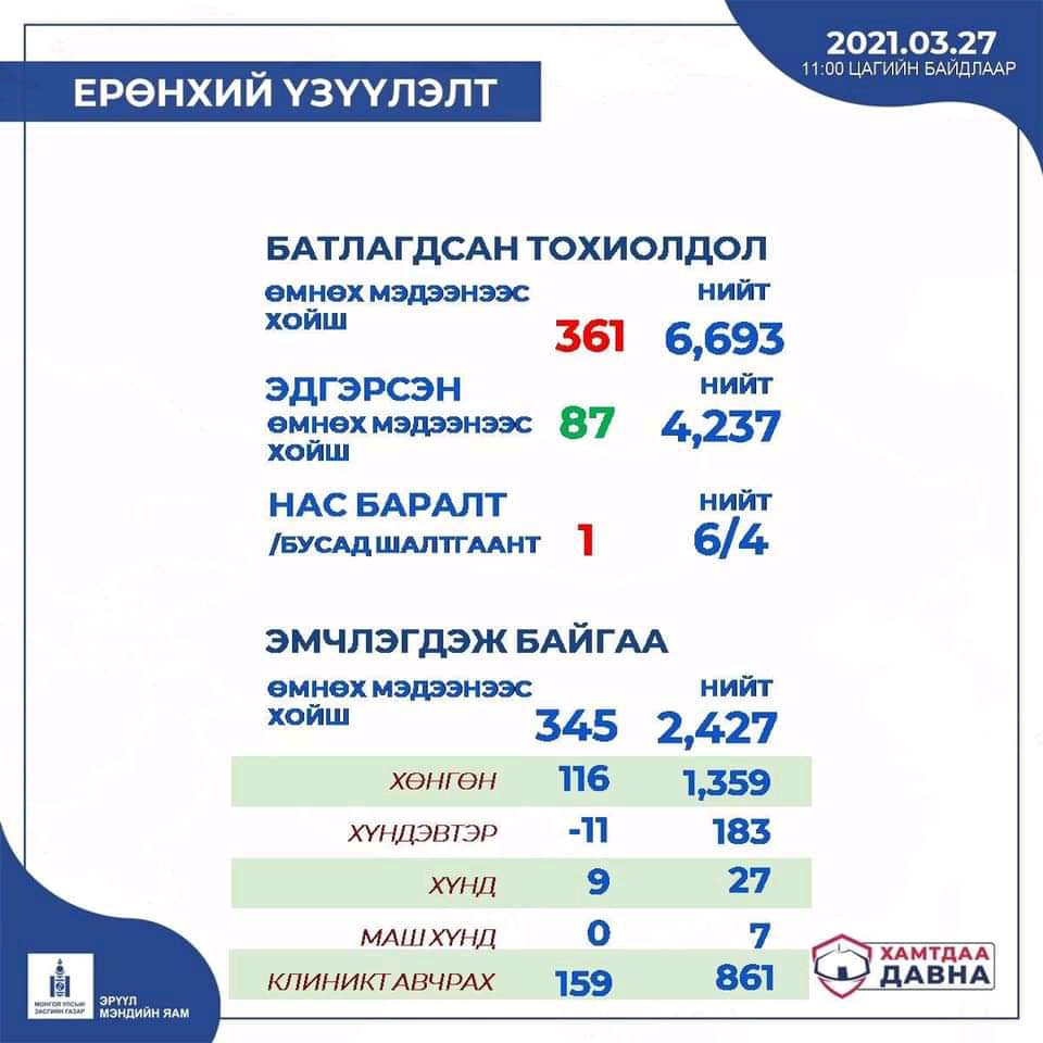 ЭМЯ-аас коронавируст халдварын нөхцөл байдлын мэдээллийг хүргэж байна. /2021.03.27, 11:00 цаг/