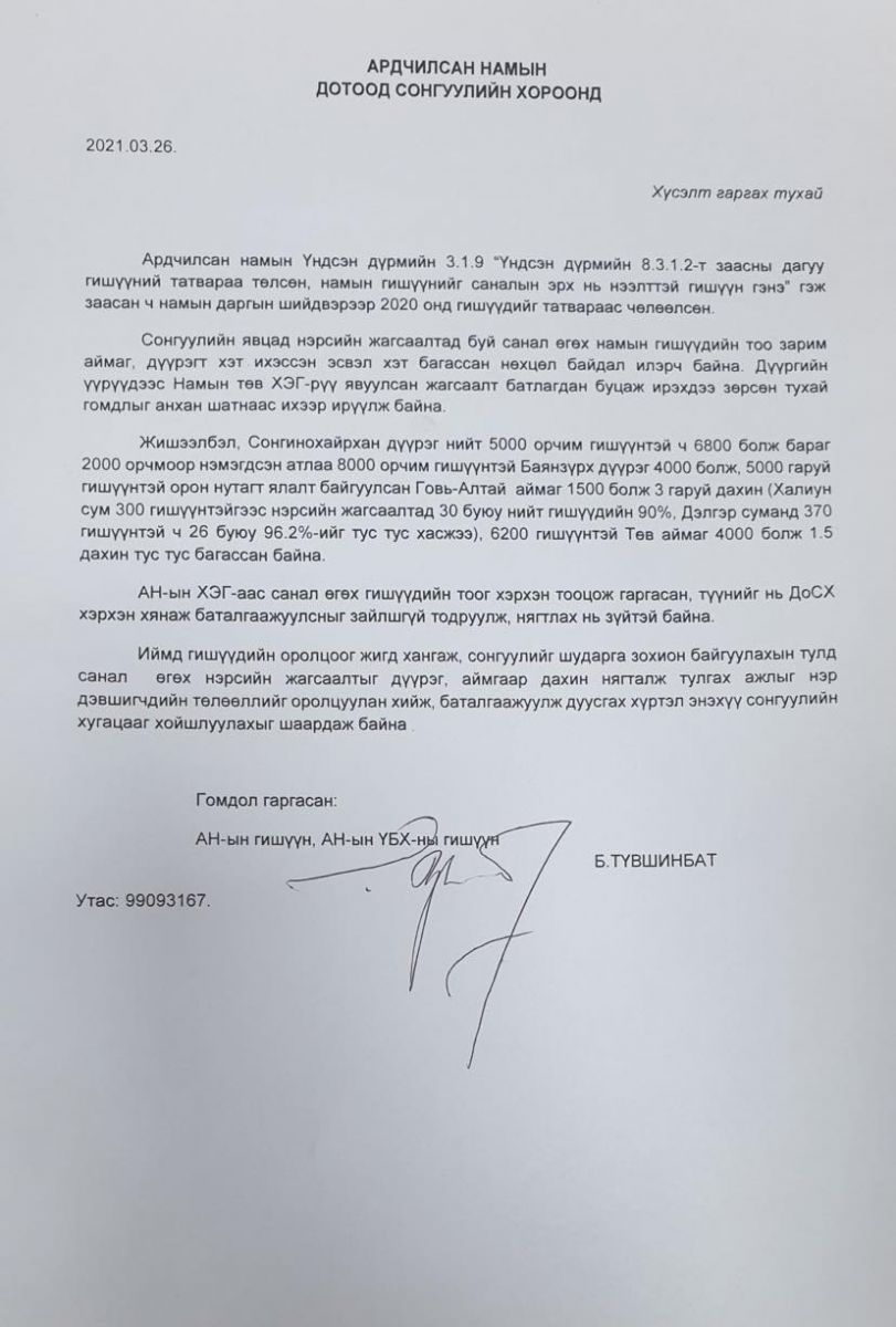 АН-ын гишүүн Б.Түвшинбат АН-ын Дотоод Сонгуулийн Хороонд хүсэлт гаргажээ. Хүсэлтийг бүрэн эхээр нь хүргэж байна.