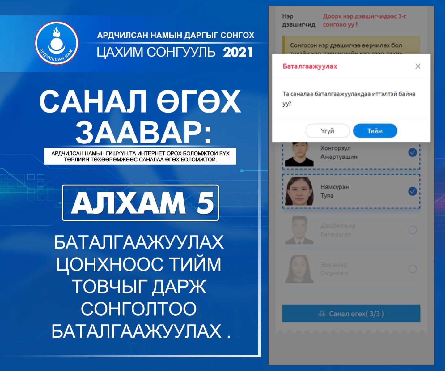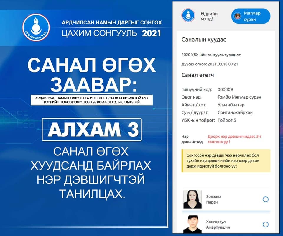 Харин С.Эрдэнийн талаас Ц.Оюунгэрэл, Ц.Уртнасан, Л.Гүндалай, Ч.Өнөрбаяр, М.Тулгат нар нэр дэвшиж байгаа. Санал хураалт 10:00 цагт эхэлсэн бөгөөд гурван хэлбэрээр санал авч байгаа юм.