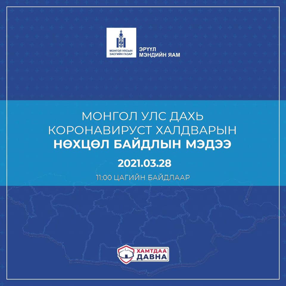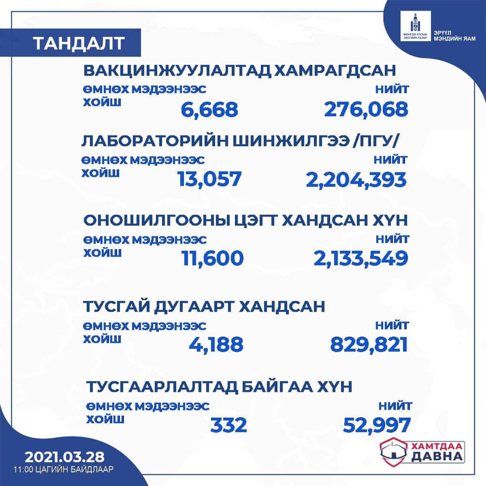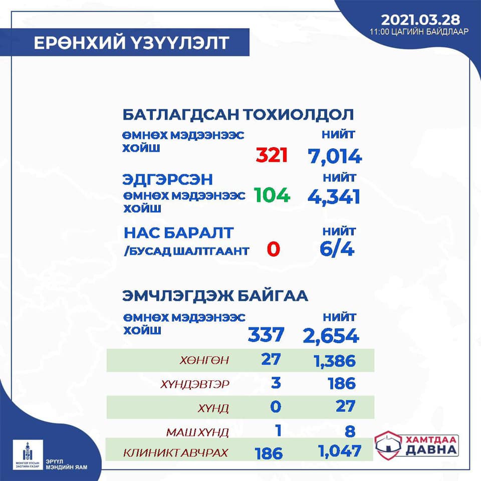 ХӨСҮТ-ийн Халдварын тандалт, судалгааны албаны дарга Ж.Байгалмаа "Өнөөдөр /2021.03.28/ 09:00 цагийн байдлаар нийт 13057 хүнд шинжилгээ хийхэд 321 тохиолдол шинээр бүртгэгдлээ. Ингэснээр Монгол Улсад батлагдсан тохиолдол 7014 боллоо. Өчигдөр 104 тохиолдол эдгэрч нийтдээ 4341 хүнийг эмчилж, эдгээлээ. Шинээр батлагдсан 321 тохиолдол бүгд дотоодод бүртгэгдсэн халдвар юм. Өөрөөр хэлбэл, зөөвөрлөгдөж ирээгүй. Шинэ тохиолдлын 262 нь нийслэл хотод бүртгэгдэж, нийт 5868 тохиолдол болж байна. Харин 59 нь орон нутагт бүртгэгдлээ. Өнөө өглөөний байдлаар 1607 хүн эмчлүүлж байгаагаас 1386 хөнгөн, 186 хүндэвтэр, 27 хүнд, 8 маш хүнд шинж тэмдэгтэй байна. Гэрийн тусгаарлалтад 770 гаруй хүн эмчилгээ хийлгэж байна. ЭМЯ-наас 2100 орны нөөц бэлдсэнээс 1607-д нь халдвартай иргэнээ хэвтэн эмчилж байна" гэв.