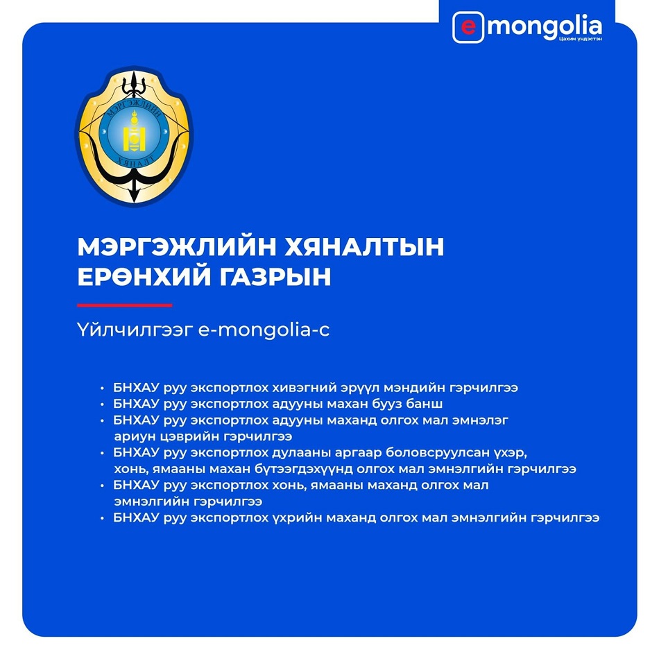 Мэргэжлийн хяналтын ерөнхий газрын үйлчилгээнүүд E-Mongolia-д орлоо. БНХАУ руу мах, махан бүтээгдэхүүн экспортлох мал эмнэлгийн дараах гэрчилгээнүүд E-Mongolia-д орлоо.