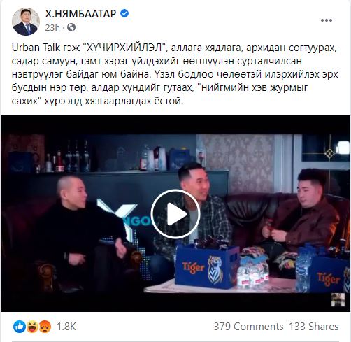 Хууль зүй, дотоод хэргийн сайд Х.Нямбаатар гэхэд "Urban Talk гэж "хүчирхийлэл", аллага хядлага, архидан согтуурах, садар самуун, гэмт хэрэг үйлдэхийг өөгшүүлэн сурталчилсан нэвтрүүлэг байдаг юм байна. Үзэл бодлоо чөлөөтэй илэрхийлэх эрх бусдын нэр төр, алдар хүндийг гутаах, "нийгмийн хэв журмыг сахих" хүрээнд хязгаарлагдах ёстой" гэсэн байр суурь илэрхийлжээ.