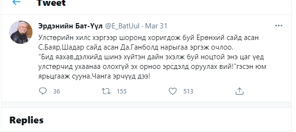 Тэрбээр "Улс төрийн хилс хэргээр шоронд хоригдож буй Ерөнхий сайд асан С.Баяр, Шадар сайд асан Да.Ганболд нарыгаа эргэж очлоо. “Бид яахав,дэлхийд шинэ хүйтэн дайн эхэлж буй ноцтой энэ цаг үед улстөрчид ухаанаа олохгүй эх орноо эрсдэлд оруулах вий" гэсэн юм ярьцгааж сууна.Чанга эрчүүд дээ" гэжээ.
