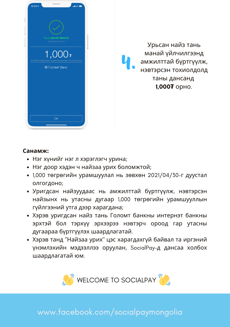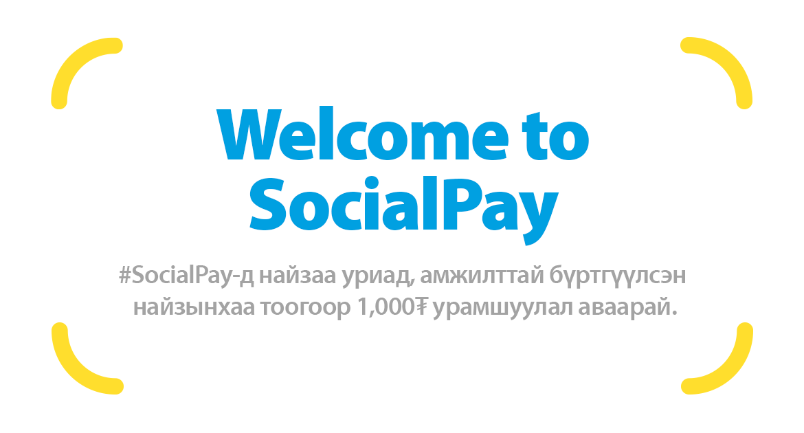 Төлбөр тооцооны хамгийн хялбар, хурдан шийдэл болсон Монголын анхны дижитал хэтэвч SocialPay хэрэглэгчдэдээ зориулан “Найзаа урих” урамшуулалт аяныг зарлаж байна. Хэрэглэгч та SocialPay аппликэйшний “Найзаа урих” цэсээр дамжуулан SocialPay-д бүртгэлгүй найздаа урилга илгээх ба урилга хүлээн авсан найз нь үйлчилгээнд амжилттай бүртгүүлэн нэвтэрсэн тохиолдолд найзаа урьсан хэрэглэгчийн дансанд 1,000₮ орно. Та хэдэн ч найзаа урих боломжтой ба урьж бүртгүүлсэн найз бүрийн тоогоор 1,000₮ урамшуулал олгох юм.