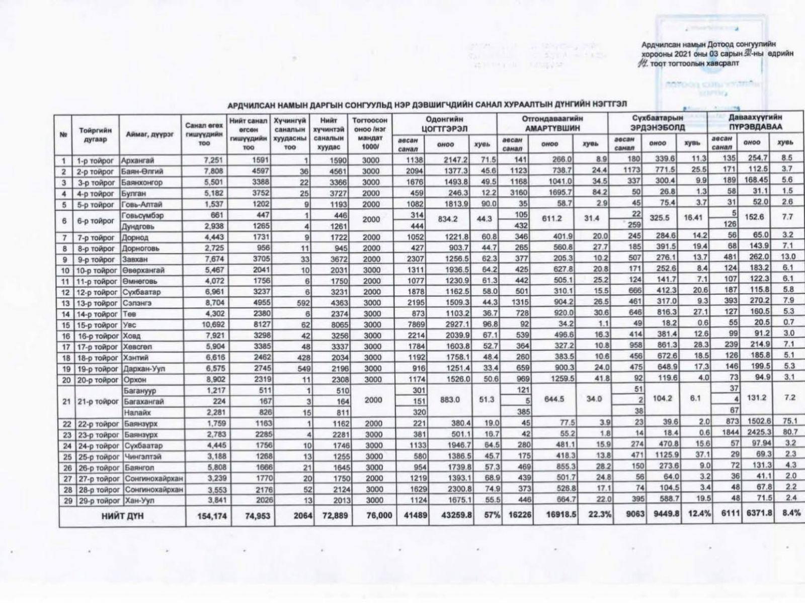 Дарханы 2745 саналын 549 нь хүчингүй болсон. Хэнтий аймагт 2462 саналын 428 нь хүчингүй хуудсыг хүчингүй болгосон. Архангайд энэ сарын 28-нд санал хураалтыг гэнэт явуулахаар шийдсэн. Гэтэл малчид шар усны үер, холбоо харилцаа муугаас болж санал хураалтад оролцоогүй аж. Баян-Өлгий зэрэг аймгийн гишүүдийн 98-100 хувь санал өгсөн хэмээн намын дарга нь гишүүдийн өмнөөс саналын хуудас бөглөсөн гэх мэт зөрчил гарсныг тэд мөн хэлэв.